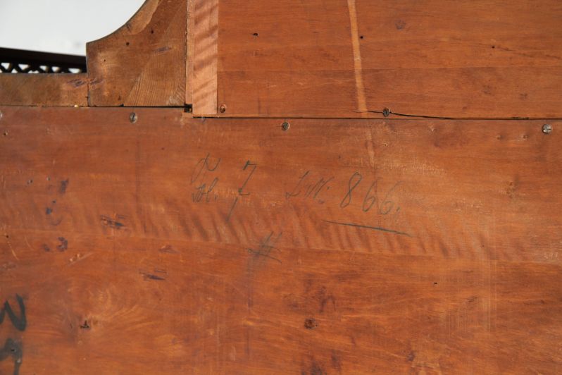 Behind the doors of the upper section, some of the formerly probably more numerous narrow drawers have been preserved, which can be pushed into the side walls of the body at any height. By turning them, they can be used either as shelves or drawers.