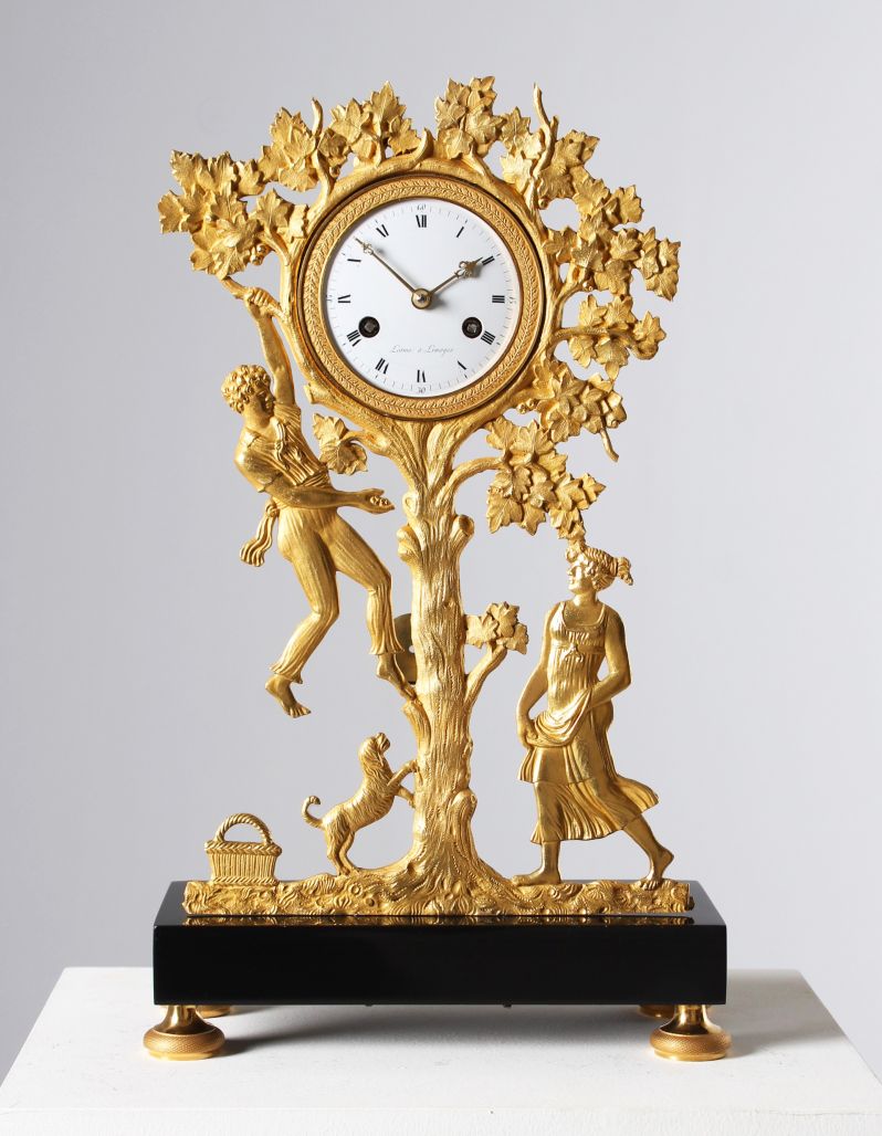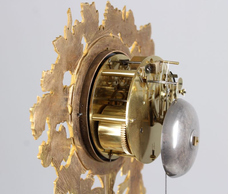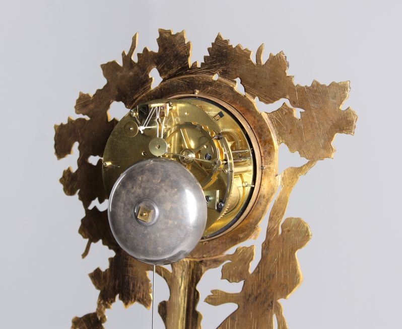 The open French pendulum movement is mounted in the centre of the treetop. It strikes on the half and full hour and the pendulum is suspended from a thread, typical of timepieces.