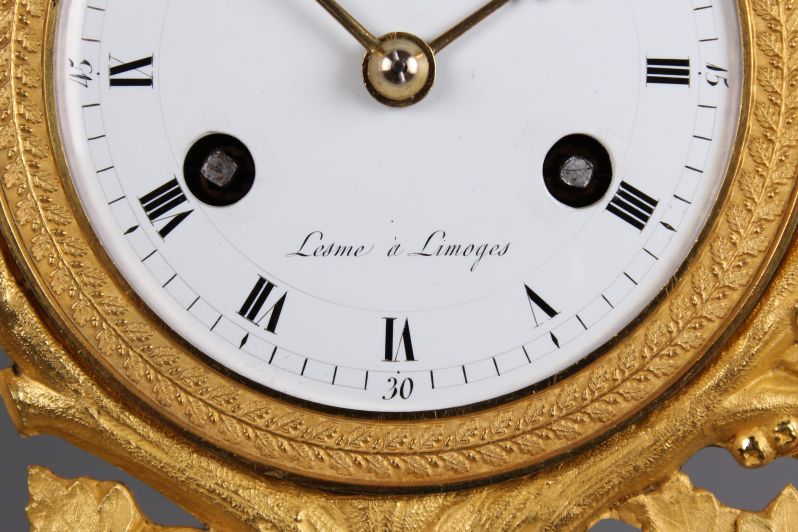The dial is framed by a bezel decorated with foliage. Roman numerals for the hours and Arabic quarter hours appear on white enamel. The minute track is painted with the finest brushstrokes, as is the signature: Lesme á Limoges.
