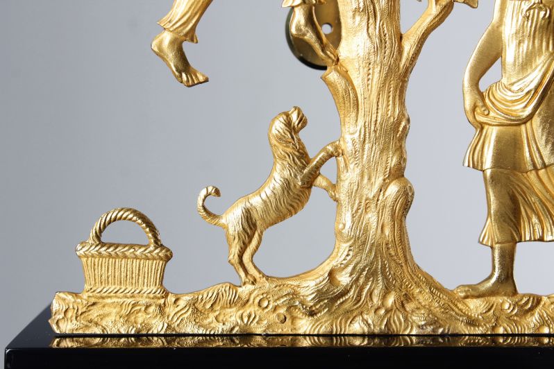 The bronze, cast in relief and then fire-gilded, stands on a black marble base supported by bell feet.