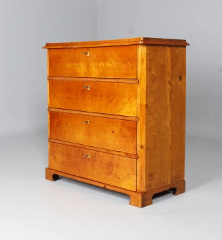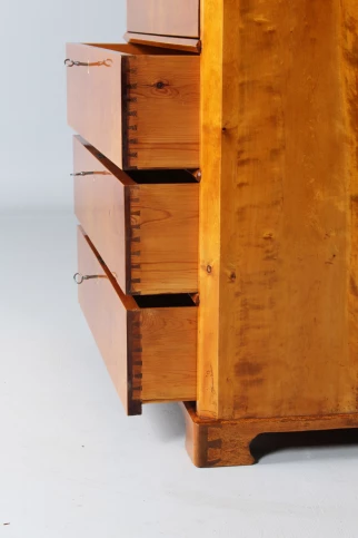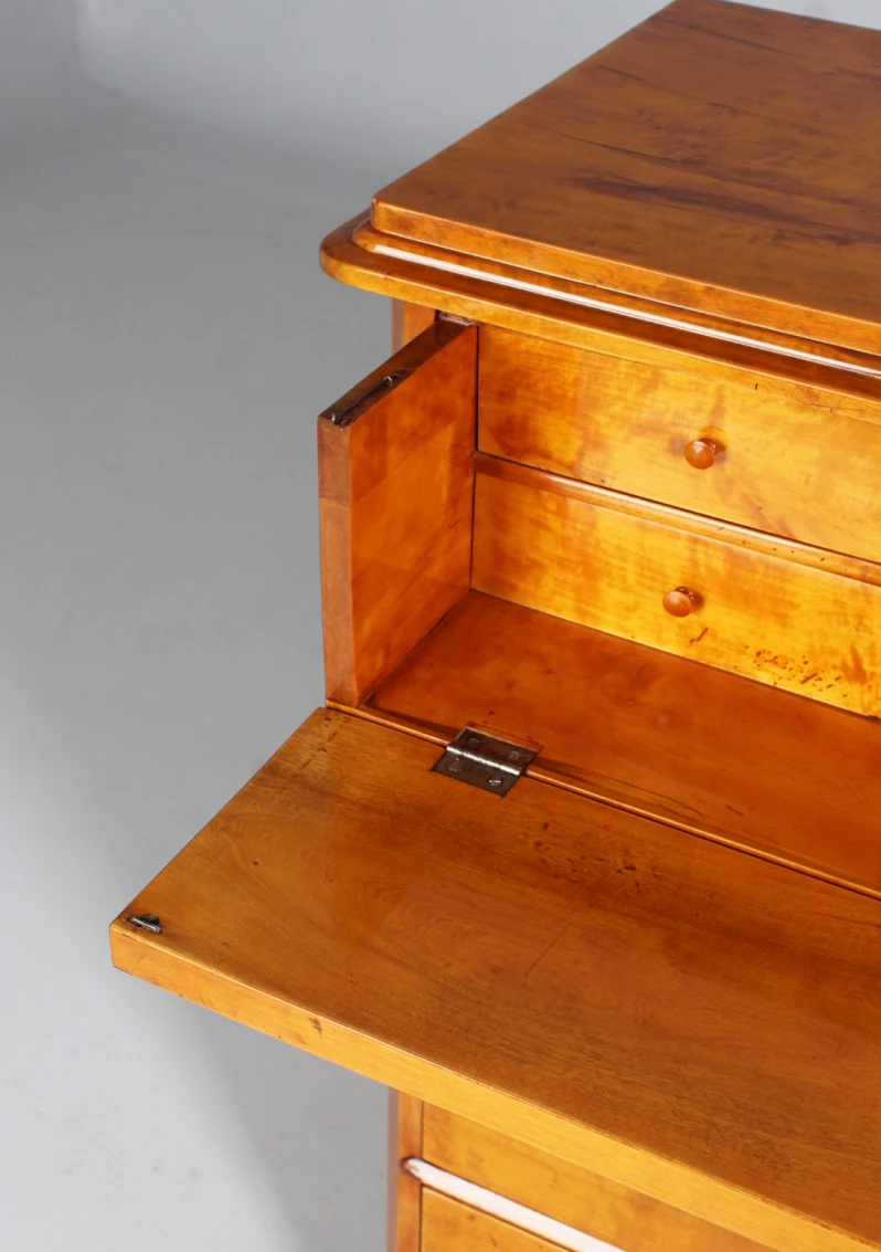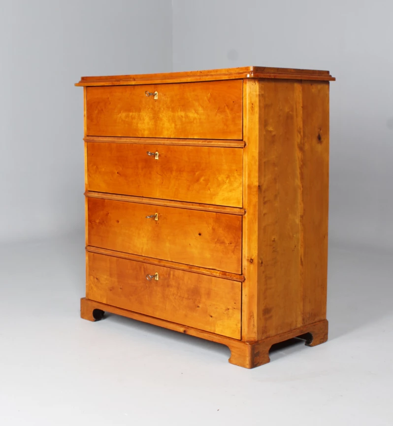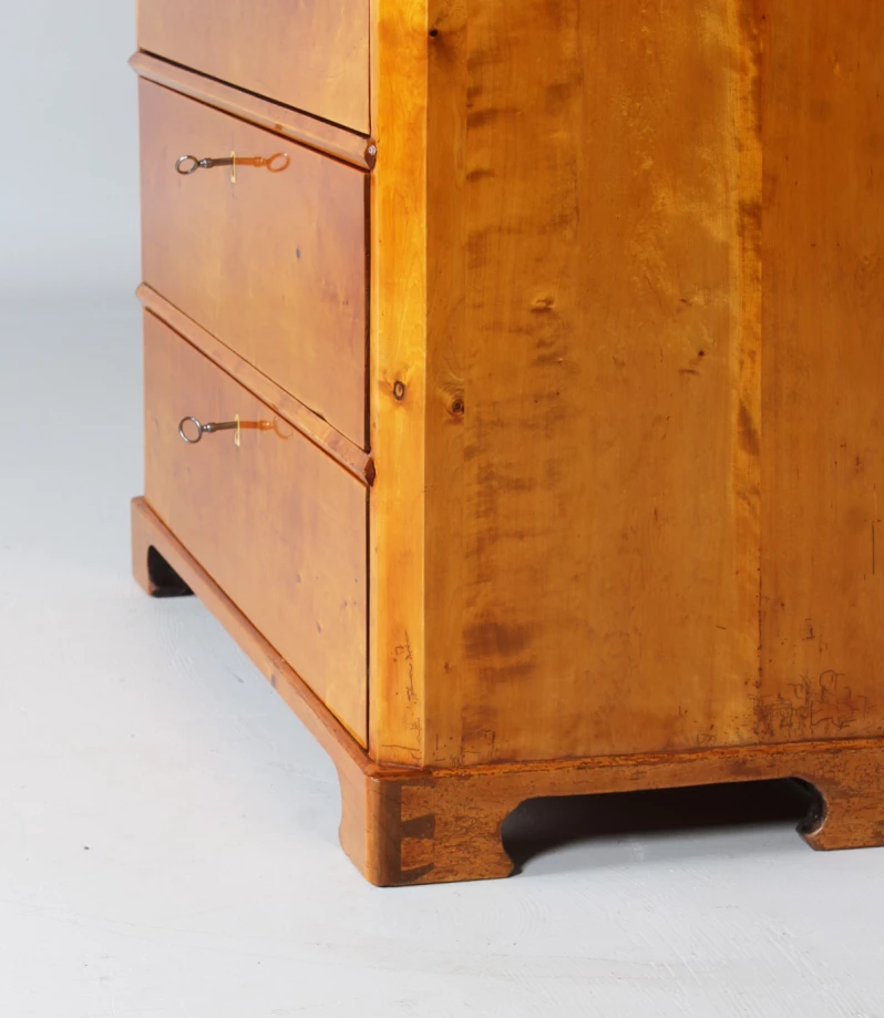 Refurbished and ready to live in. The drawers run cleanly and smoothly, the locks work. The beautiful light birch wood has been polished with shellac, preserving the original patina.