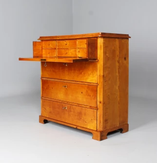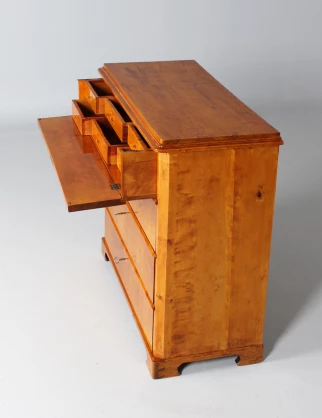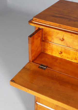 Of the four drawers, the top one is designed as a writing drawer. The front can be folded down and thus serves as a writing and working surface. Inside there are six further smaller drawers.