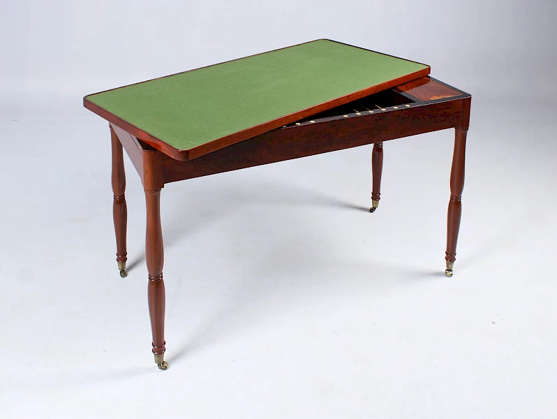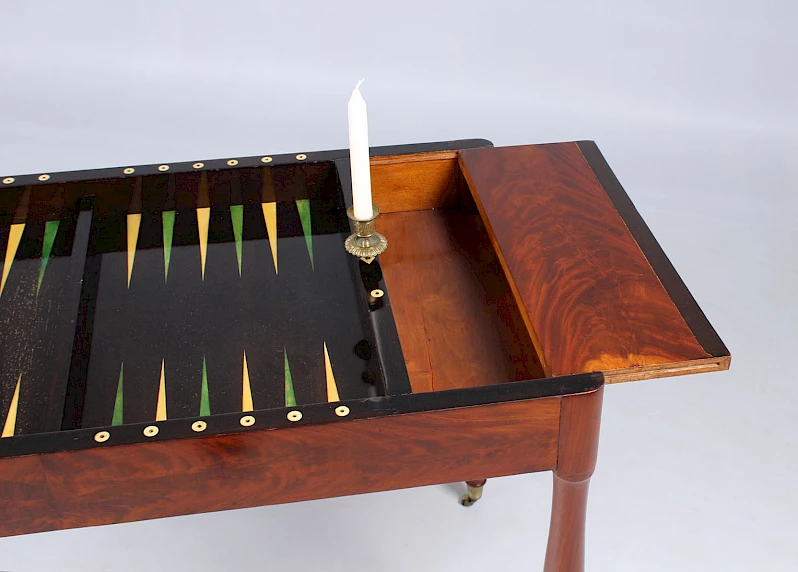 Le plateau de backgammon situé dans la table est en ivoire teinté en vert et en ivoire naturel sur une base ébonisée.