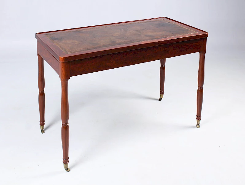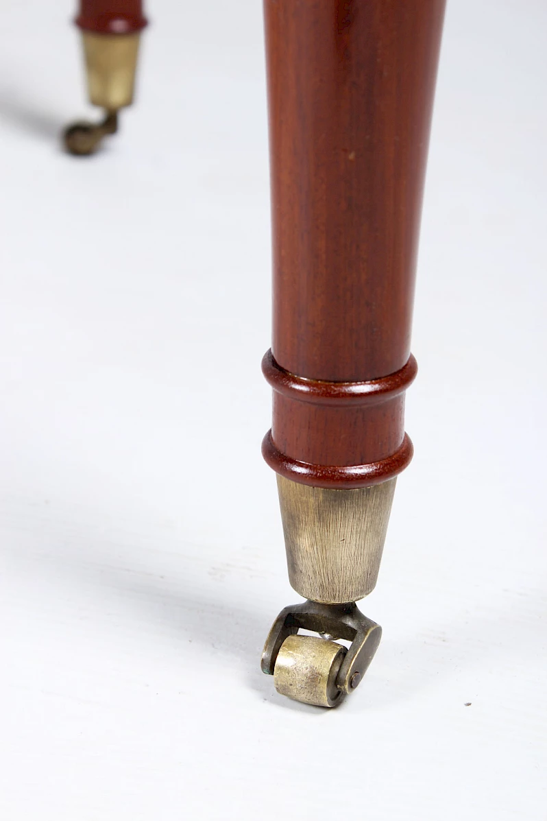 Pieds en acajou massif reposant sur de petites roulettes et dans des sabots en laiton. Les pieds sont merveilleusement galbés et profilés à plusieurs reprises, dans un style typiquement Louis-Philippe.