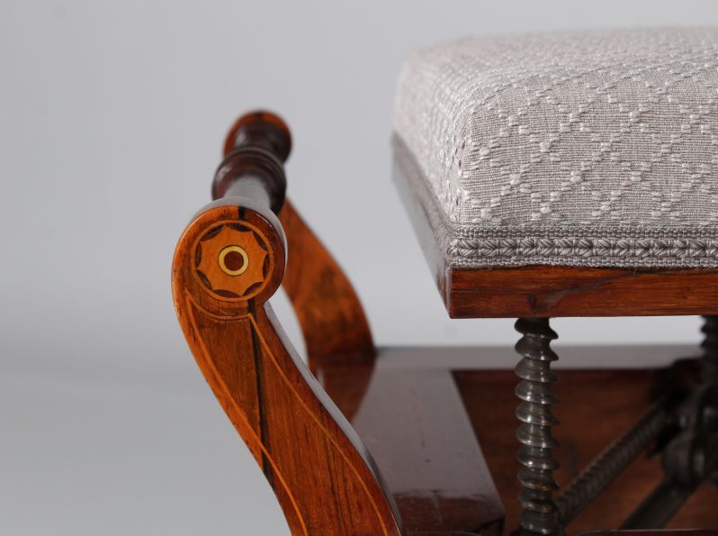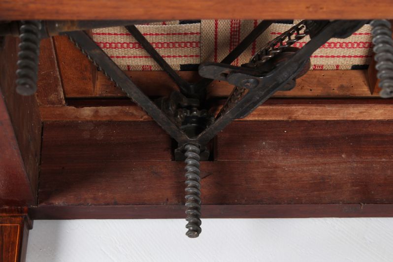 État restauré fini. Le bois est poli à la gomme-laque, la belle veinure du bois est magnifiquement mise en valeur. Les deux manivelles pour actionner le mécanisme sont d'origine. Nouveau rembourrage, nouveau revêtement.