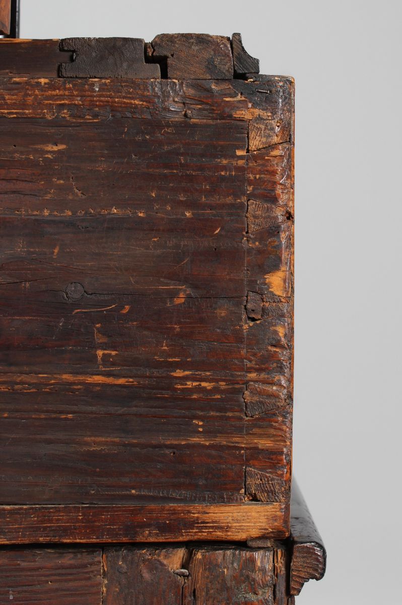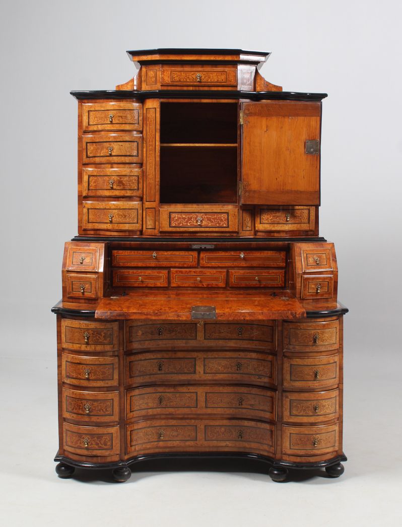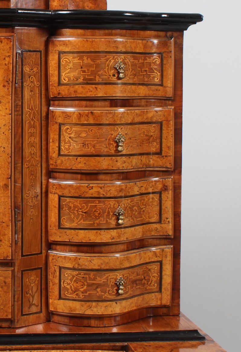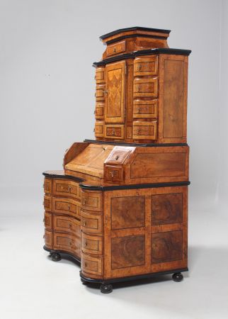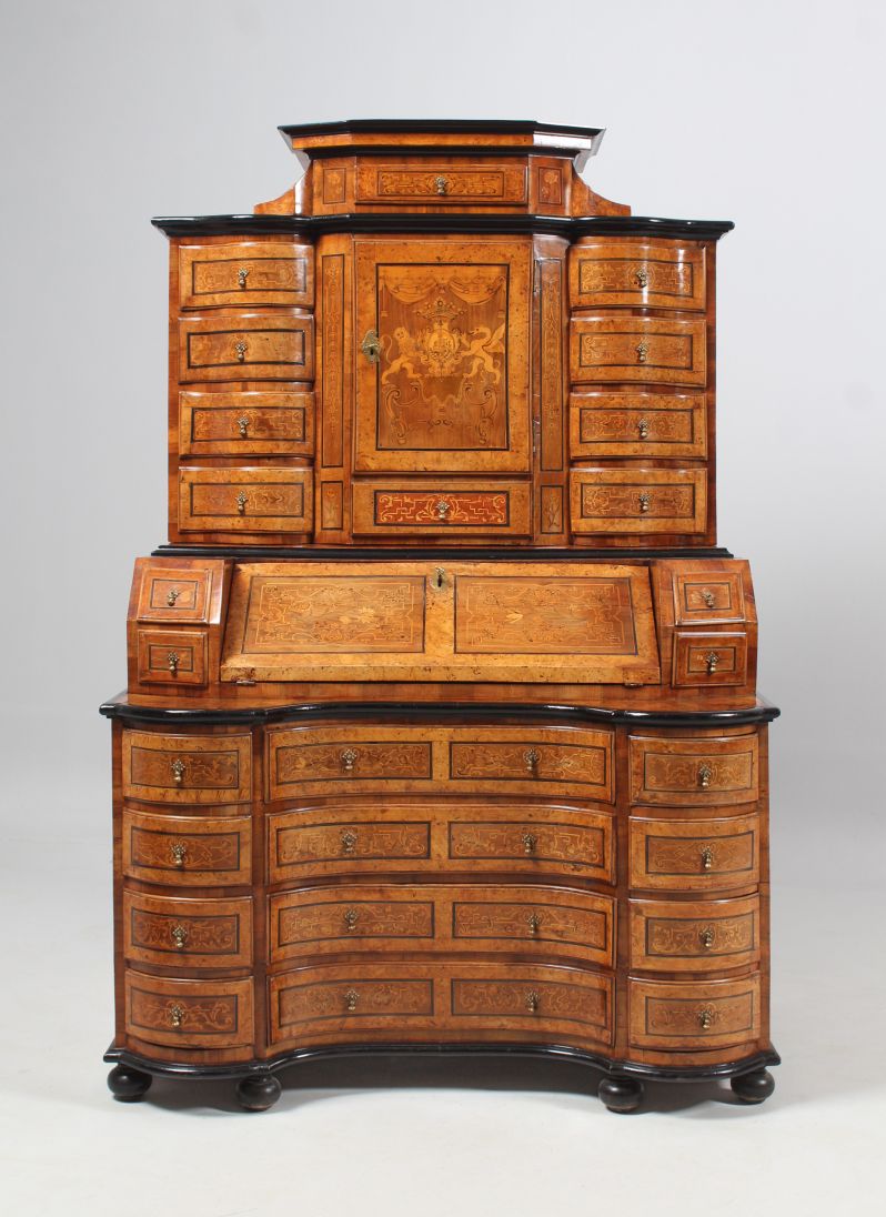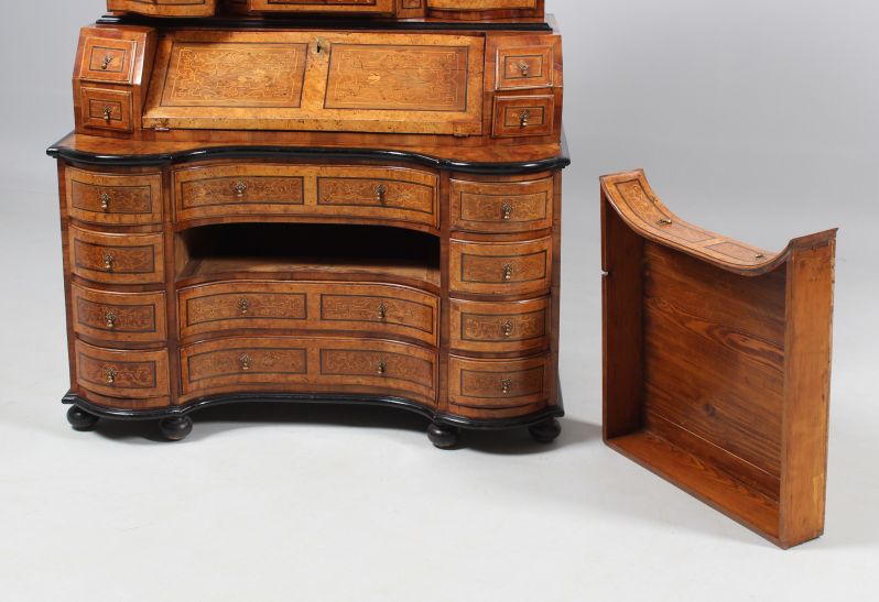 Le soubassement à quatre rangées, semblable à une commode, ainsi que la forme des marqueteries, qui correspondent encore entièrement au goût de l'époque Régence, parlent en faveur d'une création précoce, vers 1735. Les ferrures d'origine en forme de goutte, les moulures ébonisées et les pieds sphériques sont également d'époque.