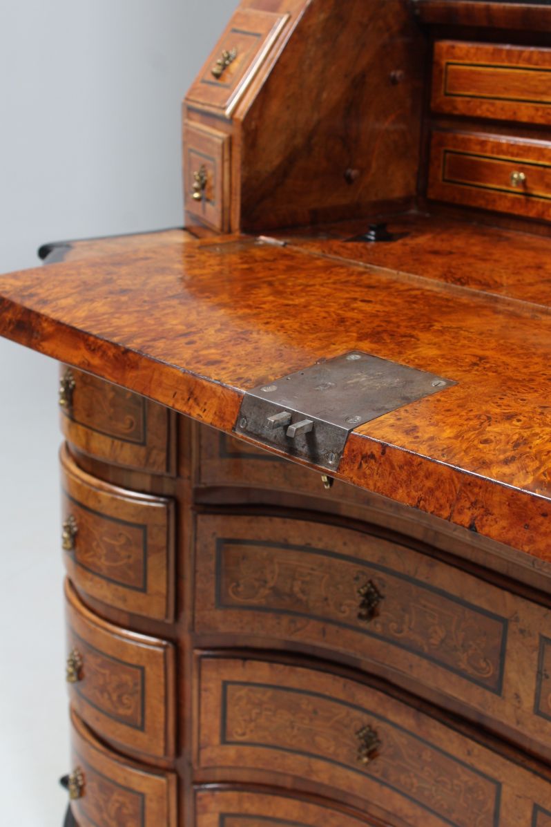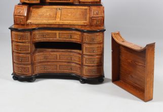 La partie écriture au-dessus est dotée d'un volet incliné et de deux tiroirs superposés à gauche et à droite. L'abattant est verrouillable. À l'intérieur se trouvent cinq autres tiroirs. En outre, nous trouvons ici les verrouillages centraux massifs pour les 12 tiroirs du soubassement ainsi que les verrouillages à goupille pour les tiroirs flanquants.