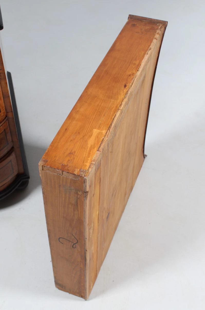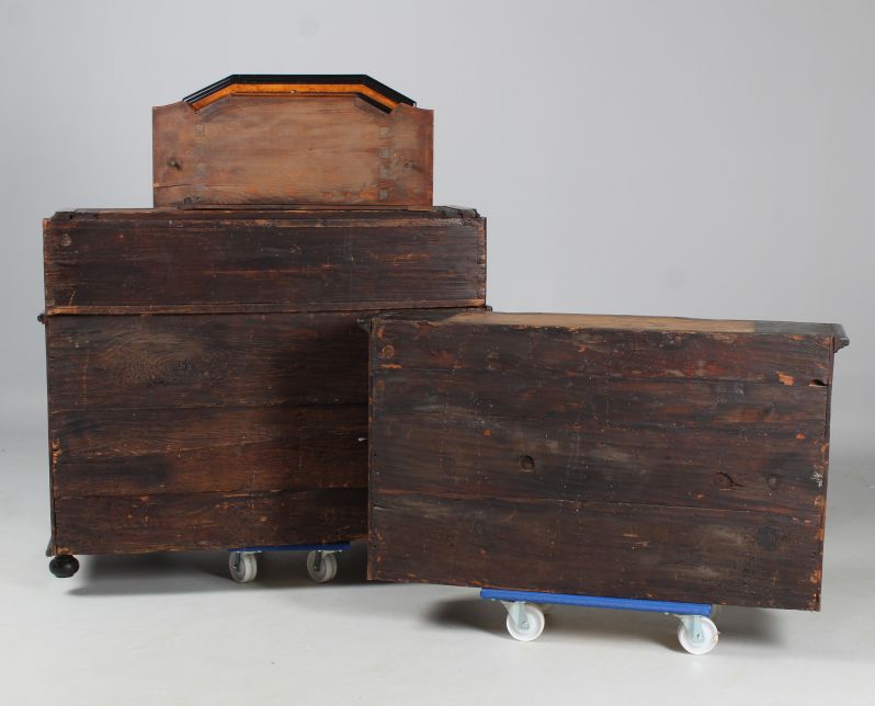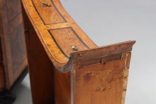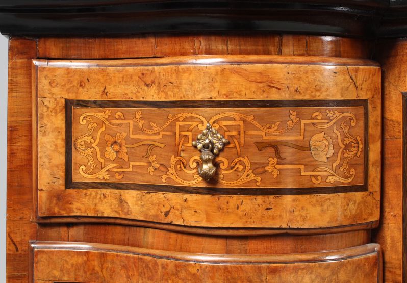 Les marqueteries fines et détaillées attirent l'attention et impressionnent au plus haut point. Si l'on compare les travaux de marqueterie des tiroirs superposés, on constate que chaque forme de conception est particulière - des rubans géométriques enroulés sur eux-mêmes sont complétés par des éléments floraux tels que des fleurs et des acanthes.