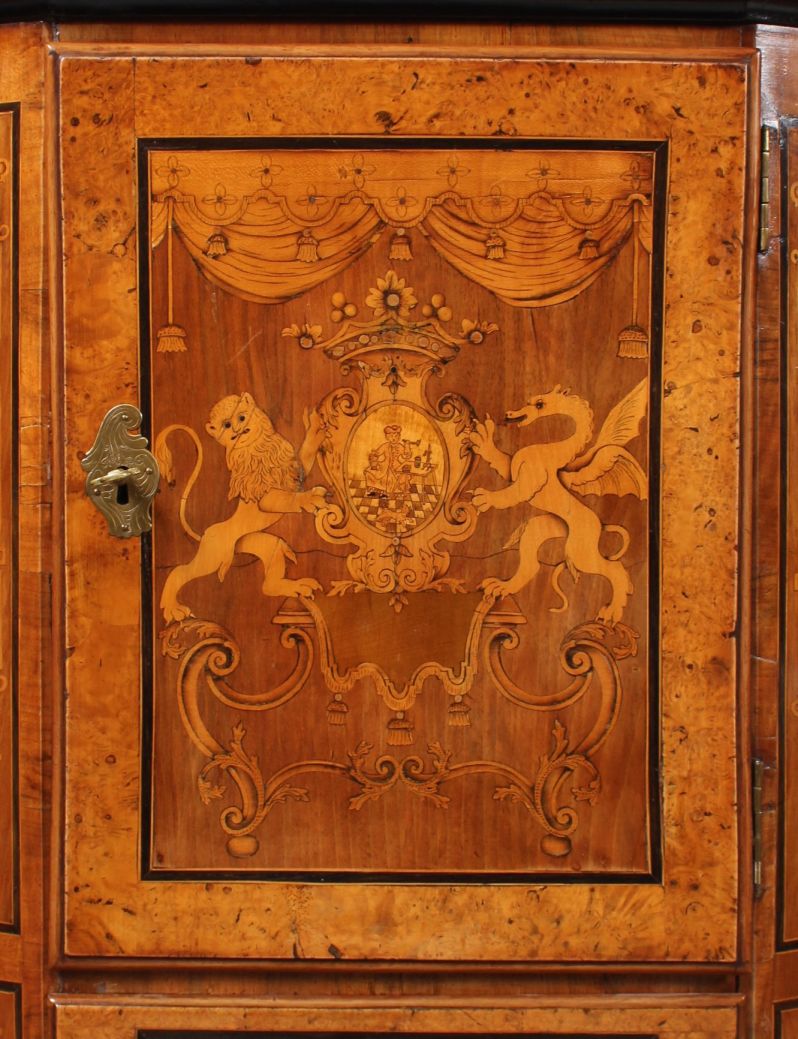 La porte centrale, située à hauteur des yeux, présente sous un dais soutenu par un lion et un dragon, un blason couronné et encadré de cartouches. Des nuances de feu et de fines gravures dans le bois d'érable confèrent à la représentation un caractère tridimensionnel.