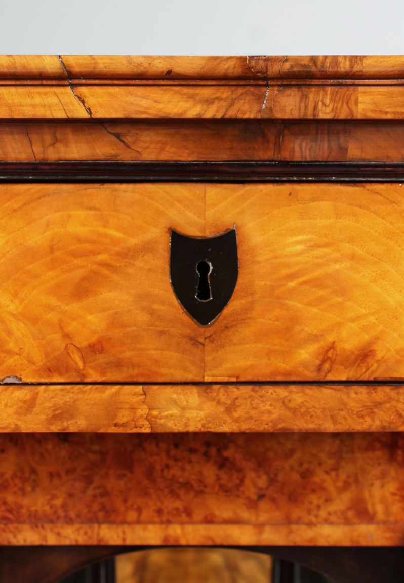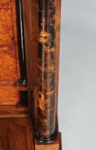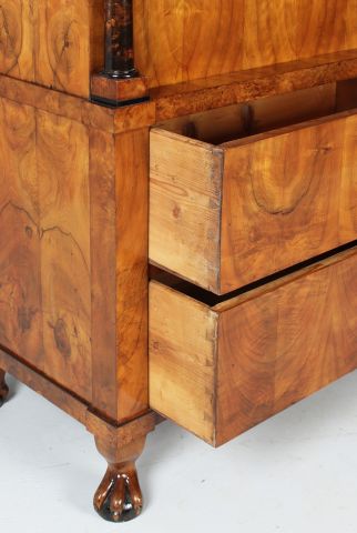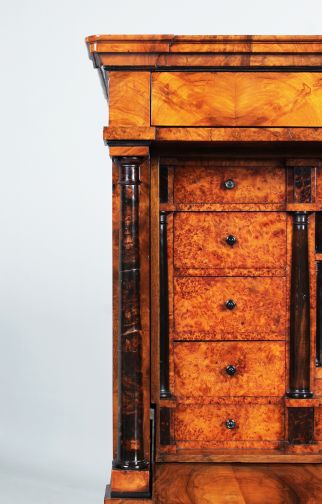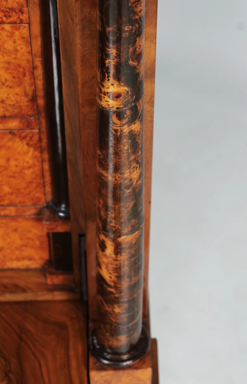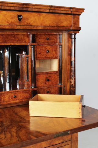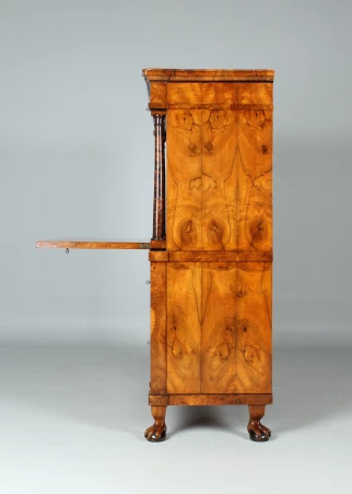 La façade est composée de deux grands tiroirs dans la partie inférieure, d'un plateau rabattable au-dessus et d'un tiroir de tête plus plat. Le veinage du noyer est discrètement interrompu par des accents horizontaux en bois de racine dans le socle ainsi qu'en dessous et au-dessus de l'écritoire. Deux colonnes pleines réglées en racine de bouleau massif et teinté foncé flanquent la partie secrétaire. Des plaques à clés noires en ébène créent des contrastes discrets. La corniche profilée est fabriquée en bois massif d'excellente qualité.