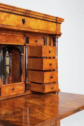 Lorsque l'on ouvre l'abattant du bureau, on découvre un intérieur à dix niveaux plaqué en bouleau. Les boutons de tirage et les colonnes ébonisés donnent le ton.