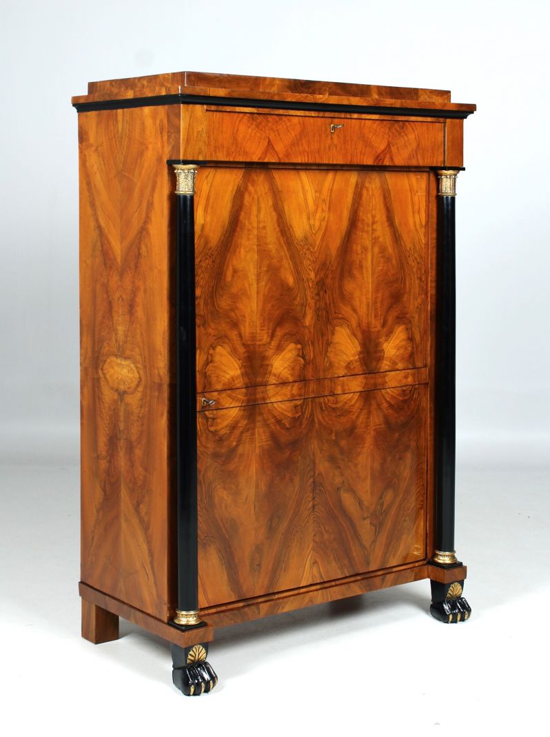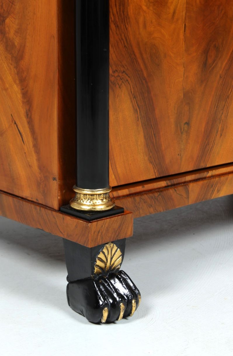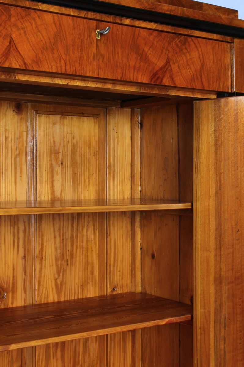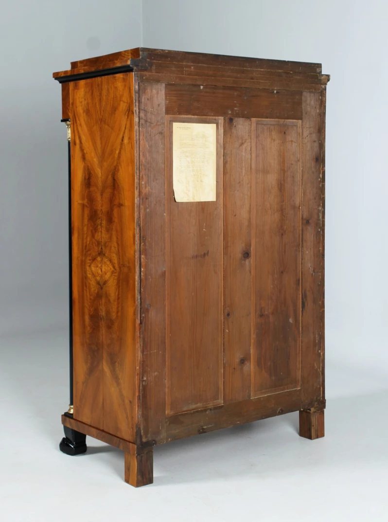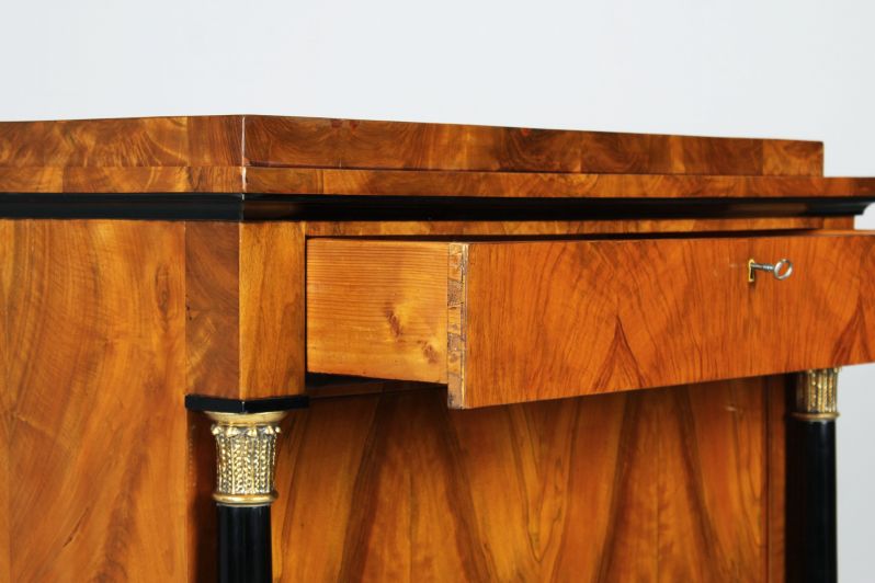 Veines posées proprement en miroir sur la façade et sur les côtés. La porte est flanquée de deux colonnes pleines qui soutiennent la tête en saillie avec le tiroir encastré. Vers le haut, le meuble se termine par une moulure creuse ébonisée et un toit à simple gradins.