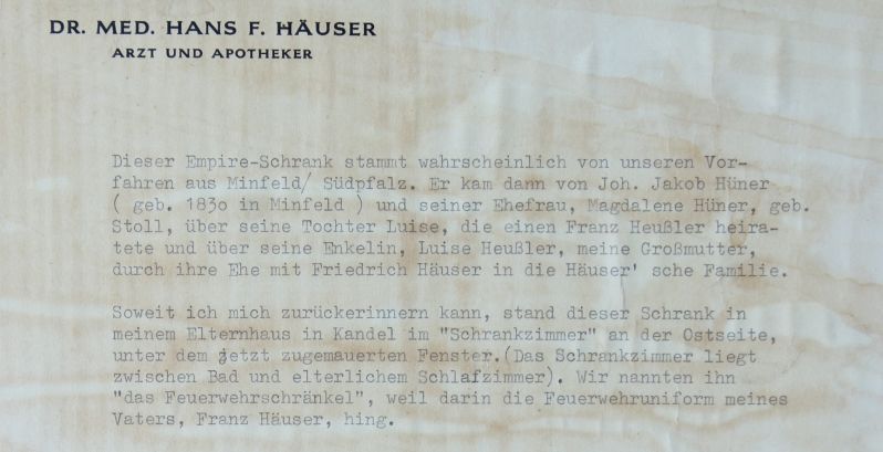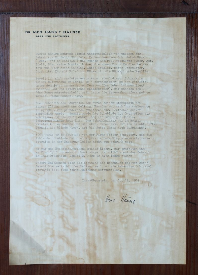 C'est exactement ce que peut faire l'armoire proposée ici. Fixée à l'arrière sur la paroi arrière, une note datant de 1967 révèle l'histoire du meuble.