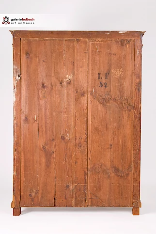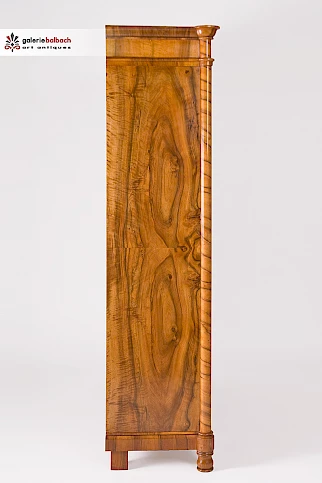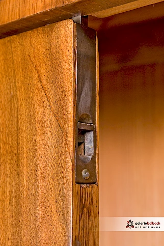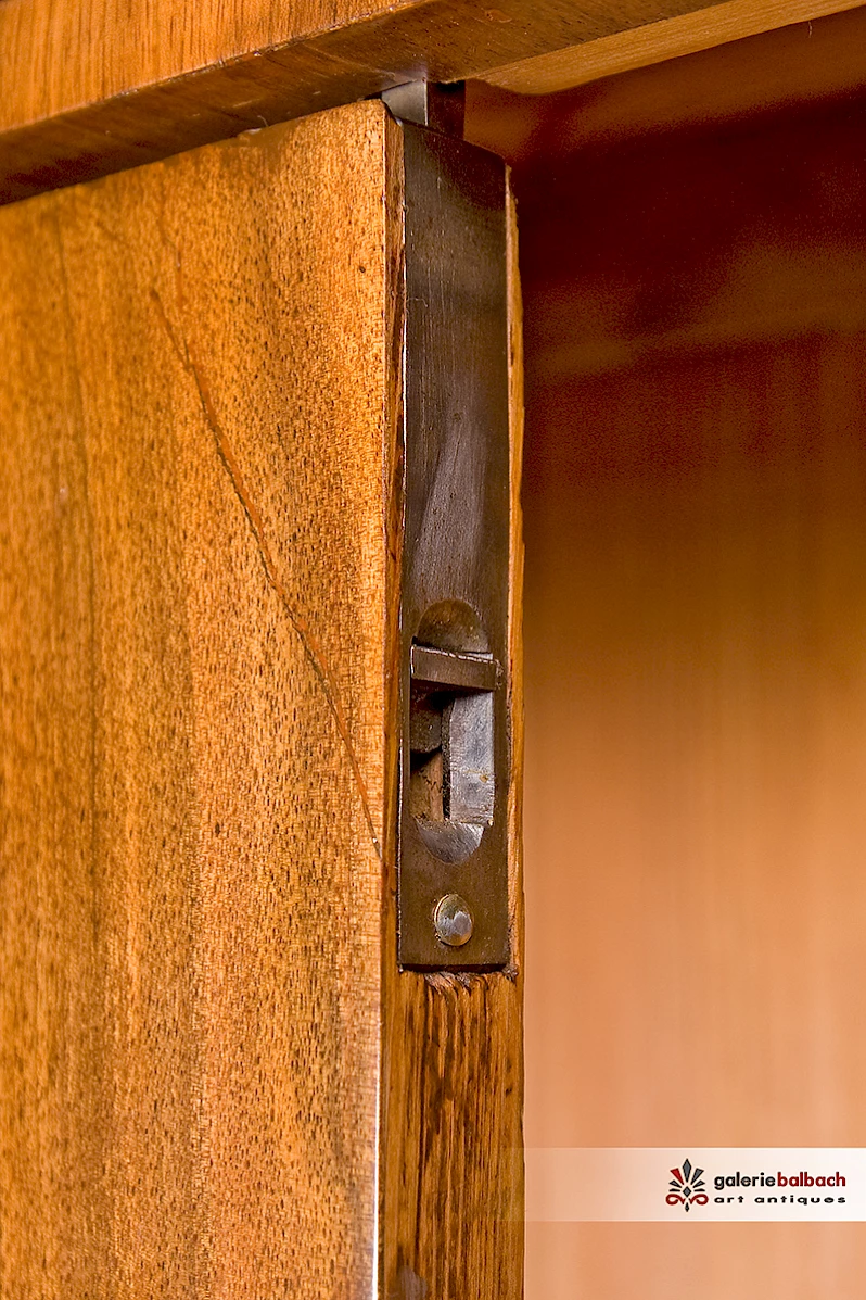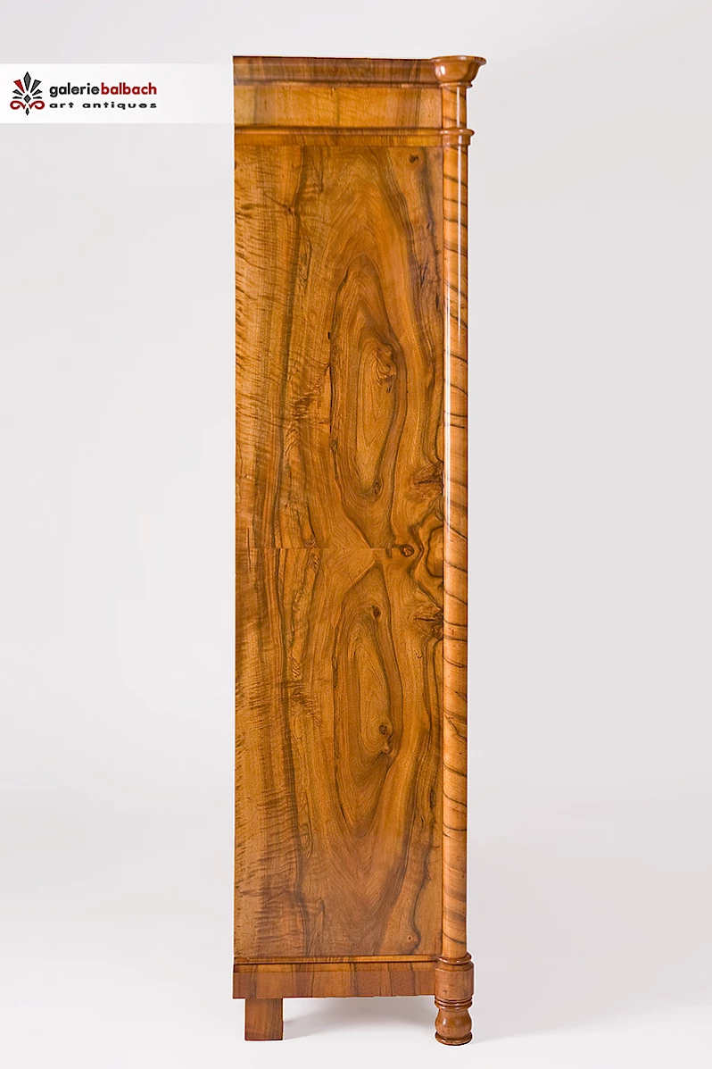 Tous les autres éléments de conception de ce meuble lui sont également soumis. Le veinage vif fait apparaître le meuble Biedermeier comme une structure fermée, aux formes réduites. Le polissage à la gomme-laque intensifie en outre la dynamique du placage.