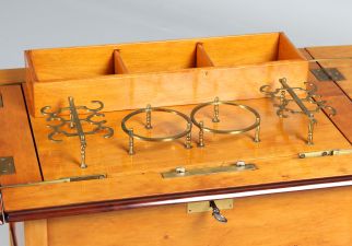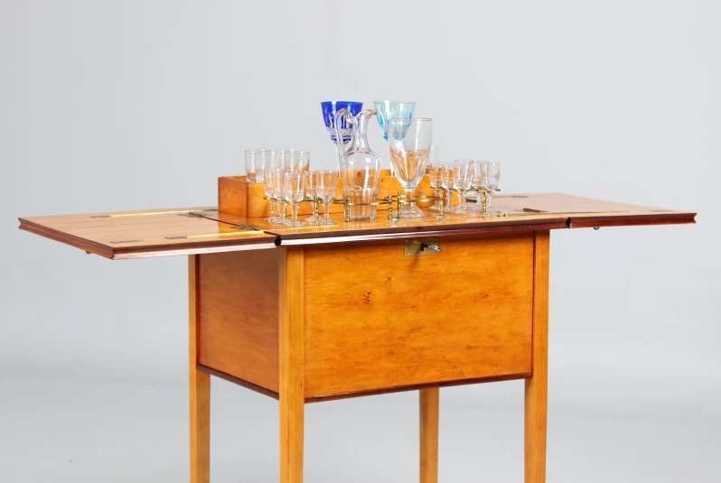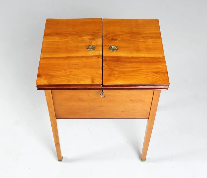 Le plateau supérieur est divisé en deux parties et s'ouvre à l'aide de deux poignées Meesing. Lors de l'ouverture, un système ingénieux soulève un compartiment préalablement encastré dans le corps du meuble.