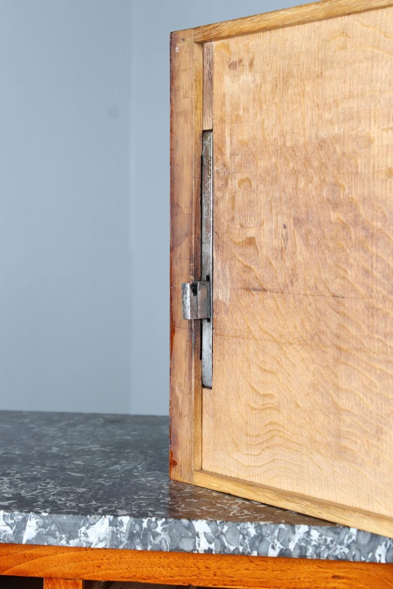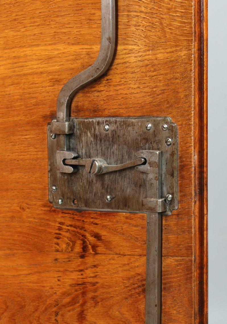 Le mécanisme de verrouillage et d'ouverture inhabituel de l'armoire est unique en son genre. Une clé permet de fermer les portes, la tablette coulissante ainsi que le tiroir central en haut et en bas. Cela est rendu possible d'une part par la serrure qui se verrouille simultanément vers le haut et vers le bas et d'autre part par un verrou monté sur la face intérieure droite de la porte.