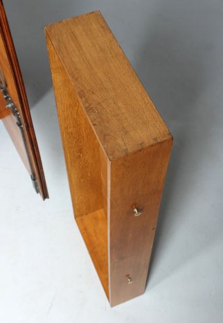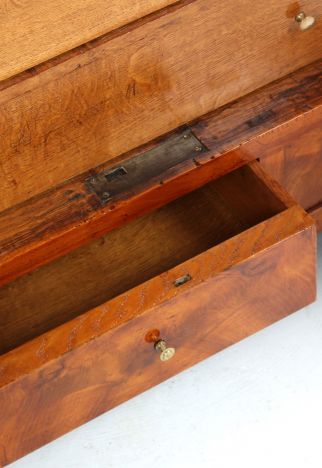 Meuble reposant sur des pieds courts et pointus, avec une vue frontale presque carrée. Nous voyons trois tiroirs en bas, deux portes au-dessus et, en haut, une rangée composée de trois tiroirs et d'une tablette coulissante. Pour ne pas interrompre le tracé du veinage, on a renoncé à une baguette de battement, mais les portes s'emboîtent les unes dans les autres par rainure et languette. On le voit bien sur l'une des photos.
