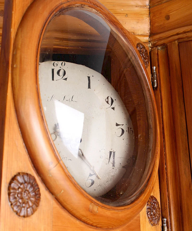 Au centre, derrière le verre bombé d'origine, nous voyons le cadran de l'horloge de parquet. Derrière la porte située en dessous, le pendule oscille et les poids fonctionnent.
