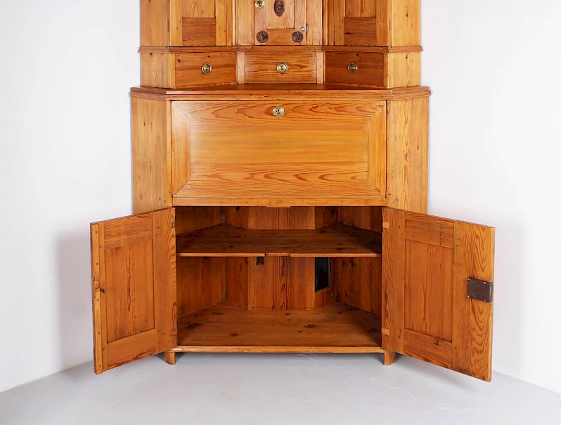 Meuble d'angle tout à fait exceptionnel avec compartiment secrétaire et horloge Mora intégrée.