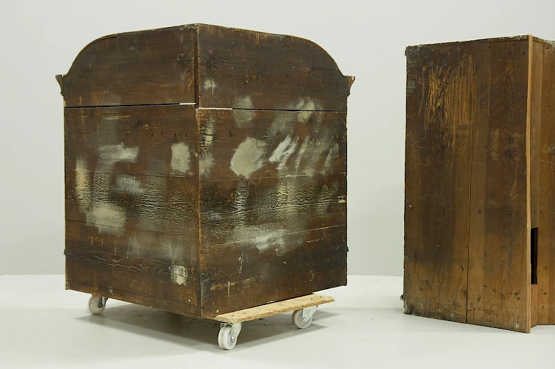 La partie supérieure se compose de deux tiroirs et d'un faux tiroir dans la partie inférieure. Au-dessus, à l'extérieur, il y a deux portes hautes qui suivent la forme incurvée de la corniche.