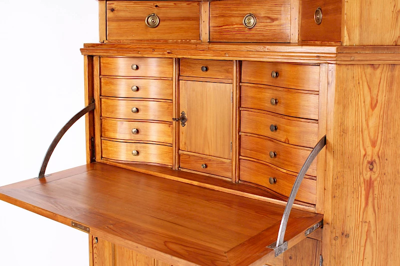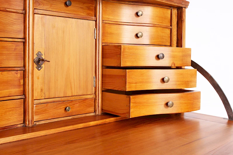 La base se compose d'un compartiment de rangement à deux portes et d'une surface d'écriture rabattable vers l'avant située au-dessus. L'intérieur comprend 12 tiroirs et une porte centrale.