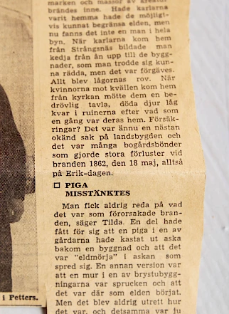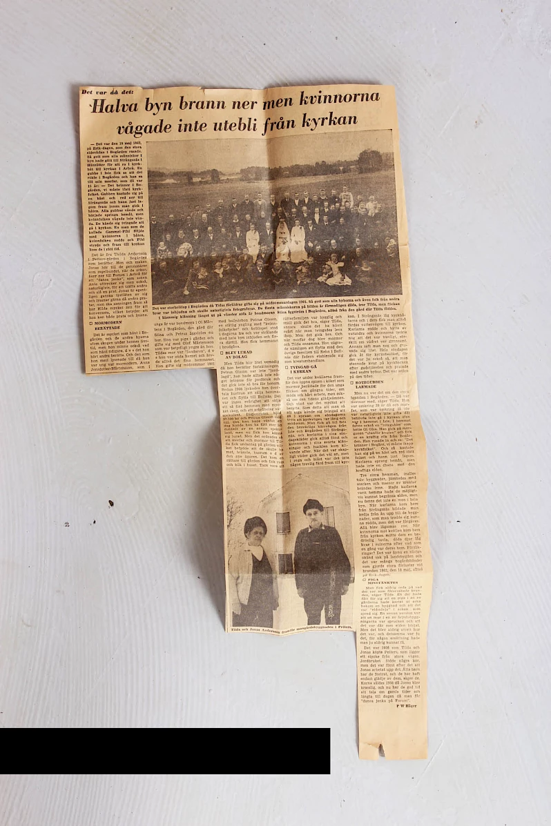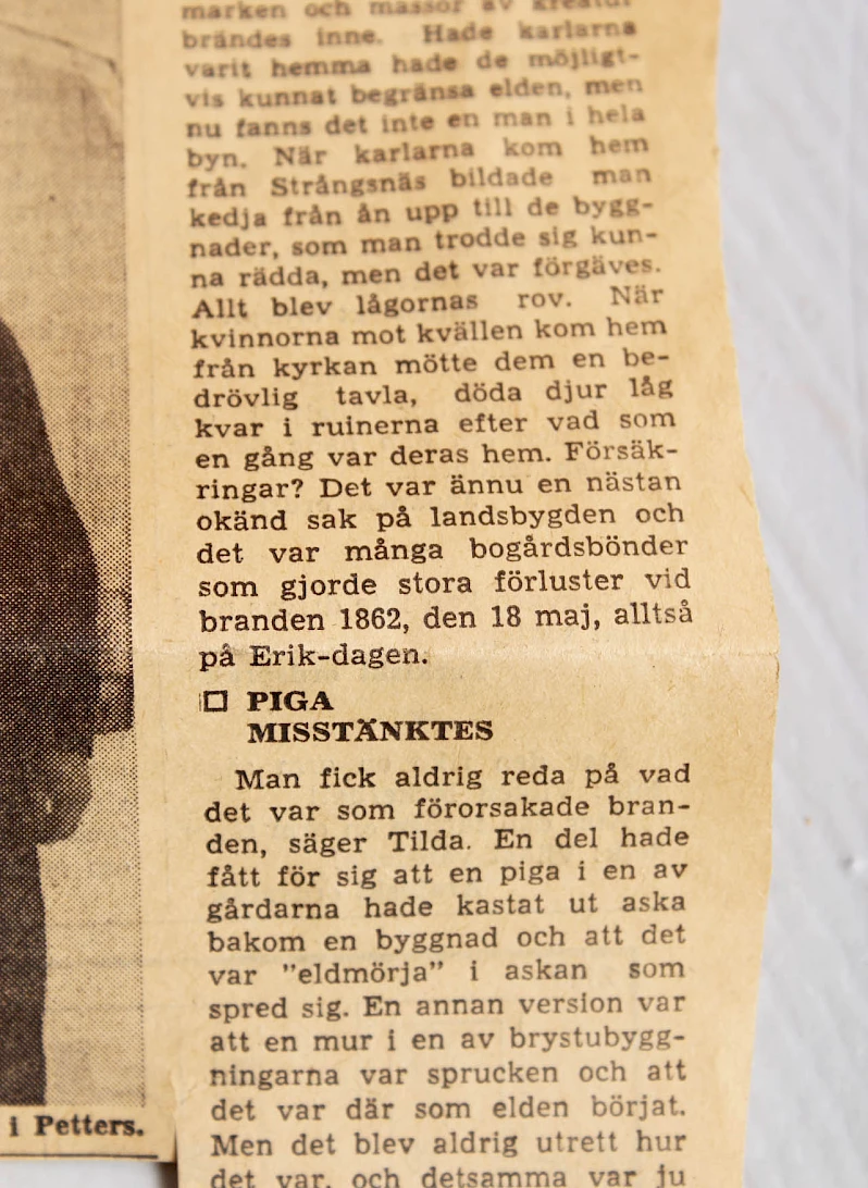 Le 18 mai 1862, c'était un dimanche, tout le village d'origine de Bogården a brûlé. Composé de trois grandes fermes, no : 1 Westegården (Erik Hans) no : 2 Bortigården (Mårtens Hans) no : 3 Östigården (Ol Hans). Une fois l'incendie éteint, presque tous les ouvriers s'étaient rendus à l'église, comme c'était la coutume à l'époque. Dans l'Östegården où le feu faisait rage, le bétail et tous les meubles ont brûlé, à l'exception de cette armoire à cloches, qu'un jeune homme nommé Anders Olsson de Lohemme (Lok Anders) a portée de ses propres mains hors de la cour en flammes. Le propriétaire Per Olsson a ensuite vendu la ferme, qui a été transférée à Dahlån suite à un changement de législation, et a acheté la ferme n° 3 de Hof. Lorsque son fils Olof Persson a vendu cette ferme vers 1912, il a signé l'armoire lors de la vente aux enchères. Les notes pour la descendance en février 1937 par P. Löfgren.