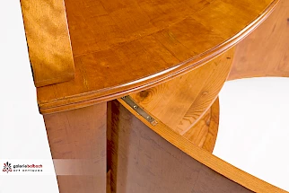 Les bois particulièrement appréciés de l'époque Biedermeier étaient le cerisier, le noyer et l'acajou, mais aussi des bois au veinage très vif comme le frêne ou, dans ce cas, le bouleau.