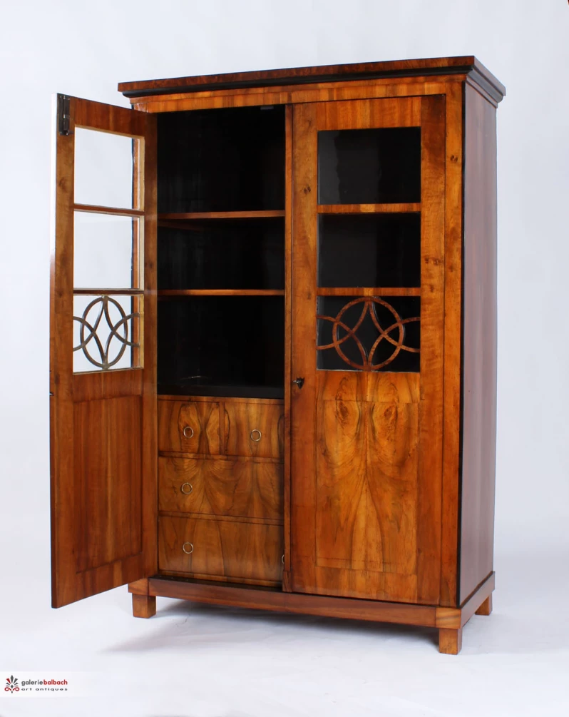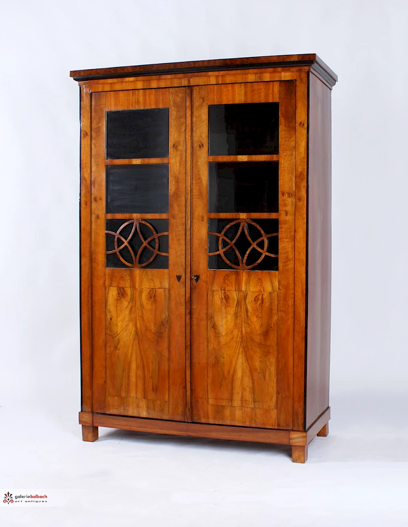 Meuble à deux portes reposant sur des pieds en forme de sabots. Les panneaux de porte inférieurs sont plaqués en noyer, les panneaux supérieurs sont vitrés, l'un d'eux est orné d'un croisillon artistique.