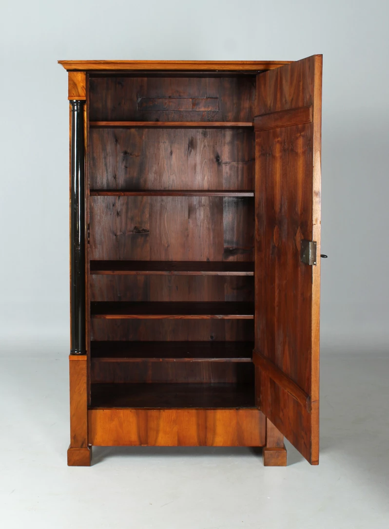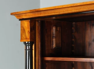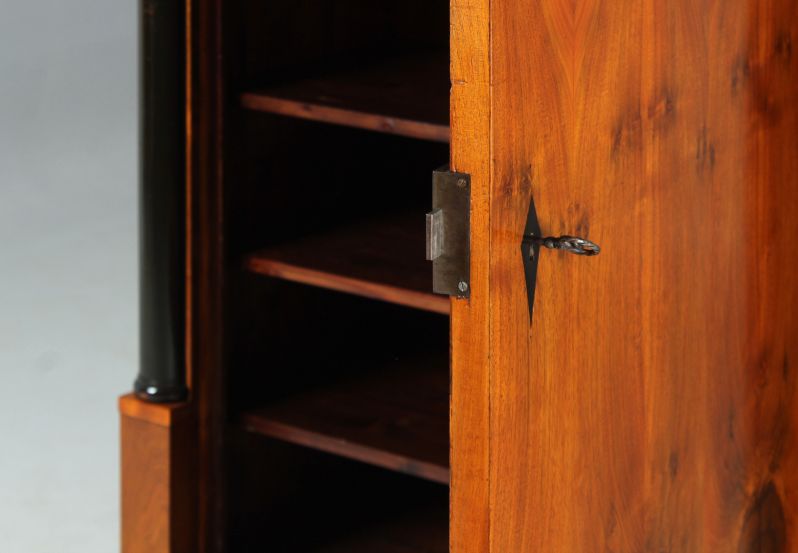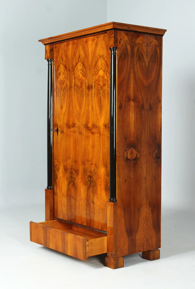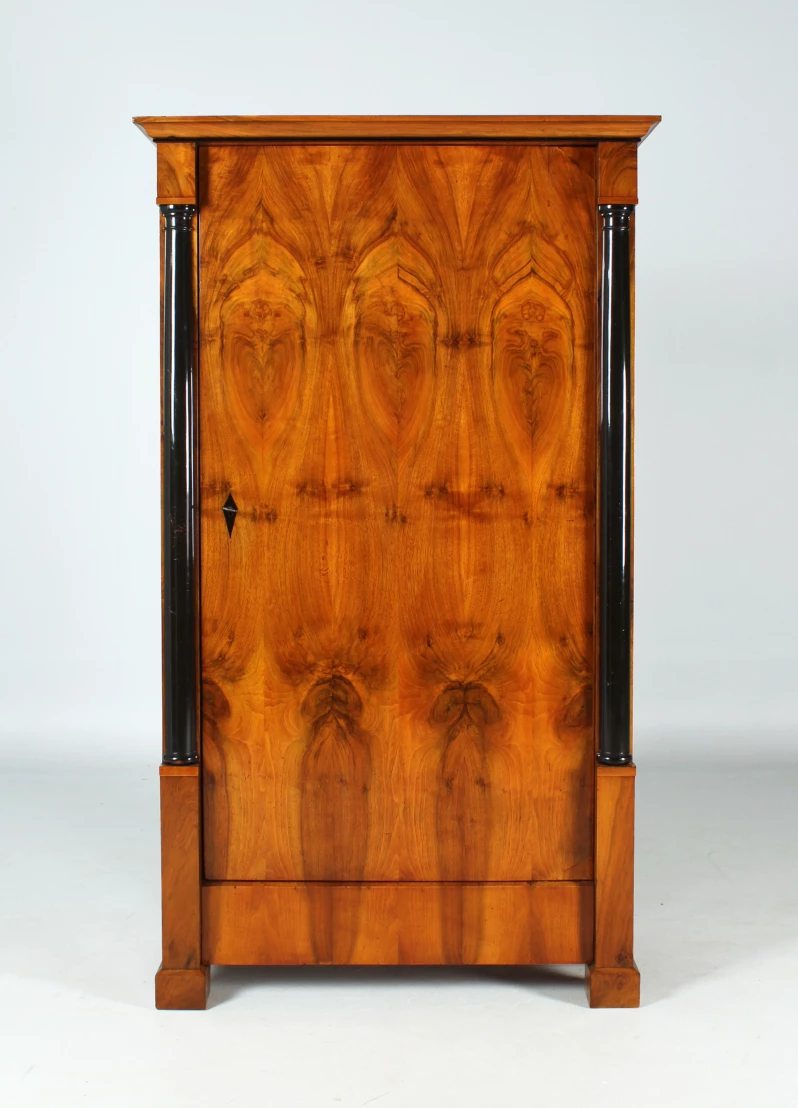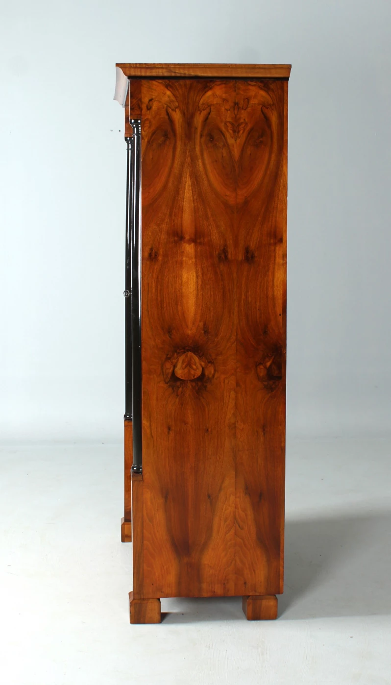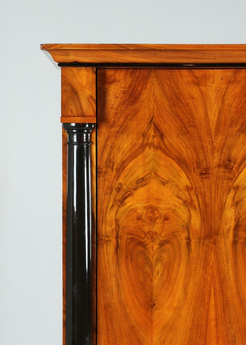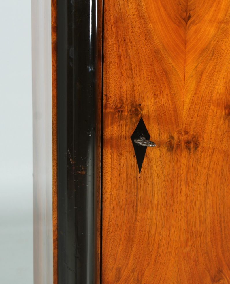 Veinage de noyer proprement posé sur toute la façade du meuble et sur les deux côtés. Des demi-colonnes ébonisées et une plaque de clé également noircie apportent de beaux accents.