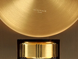 Sous le boîtier se trouve le levier d'arrêt à actionner par l'avant. Sur le côté se trouvent deux vis qui permettent de mettre la montre à niveau. À l'arrière, nous voyons la boîte à pression dorée, estampillée LeCoultre & Cie Swiss.