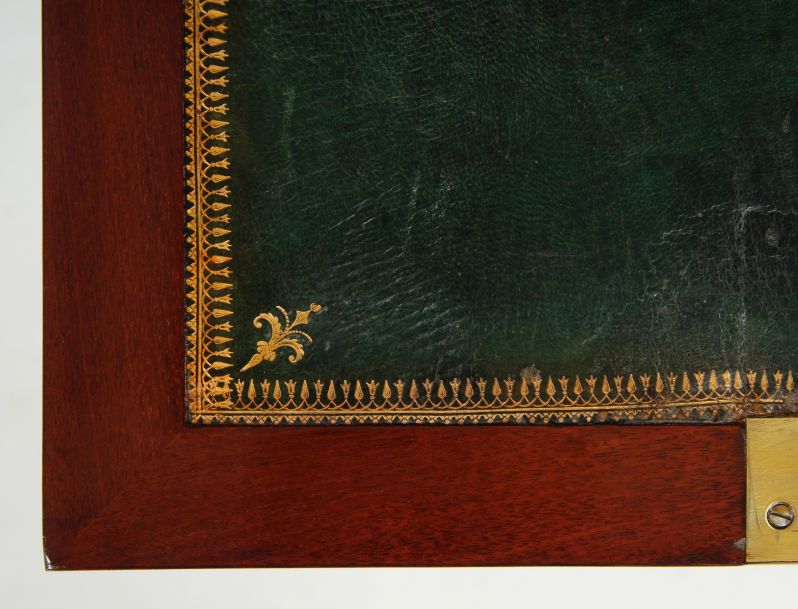 L'écritoire est conçue de manière fonctionnelle avec deux larges tiroirs et une surface d'écriture recouverte de cuir. La surface en cuir d'origine est merveilleusement bien conservée avec ses frises périphériques poinçonnées et dorées.