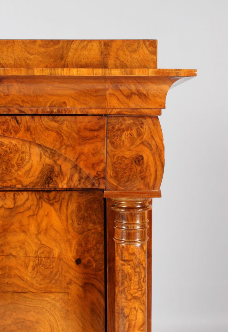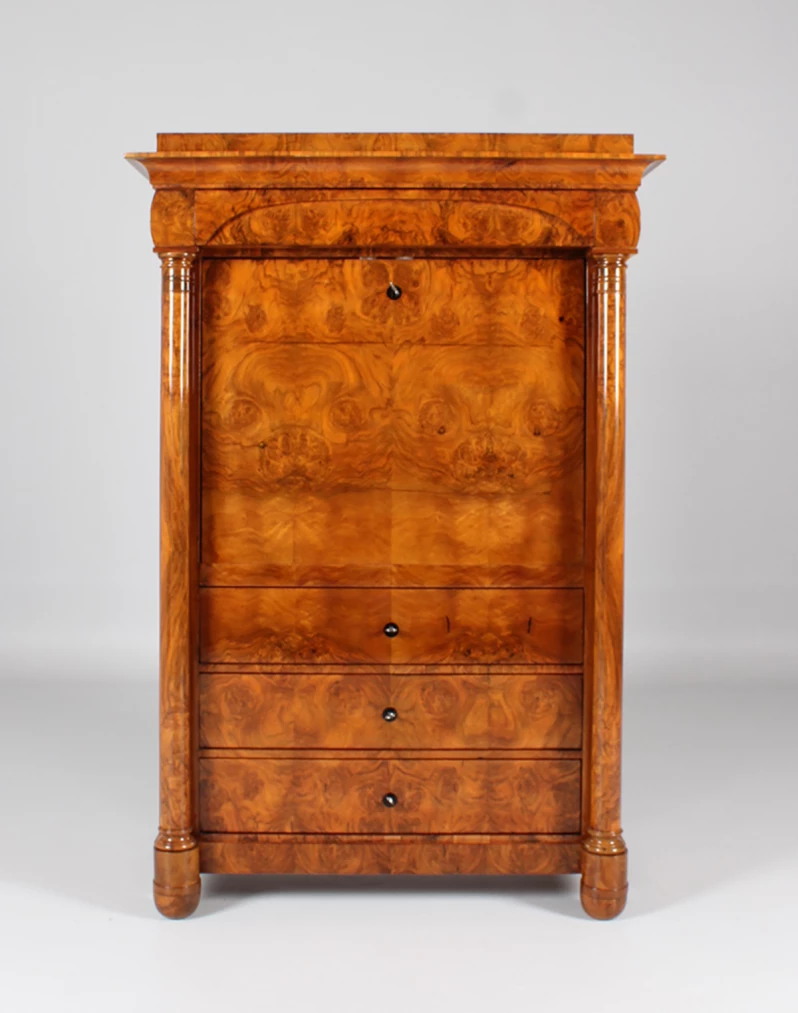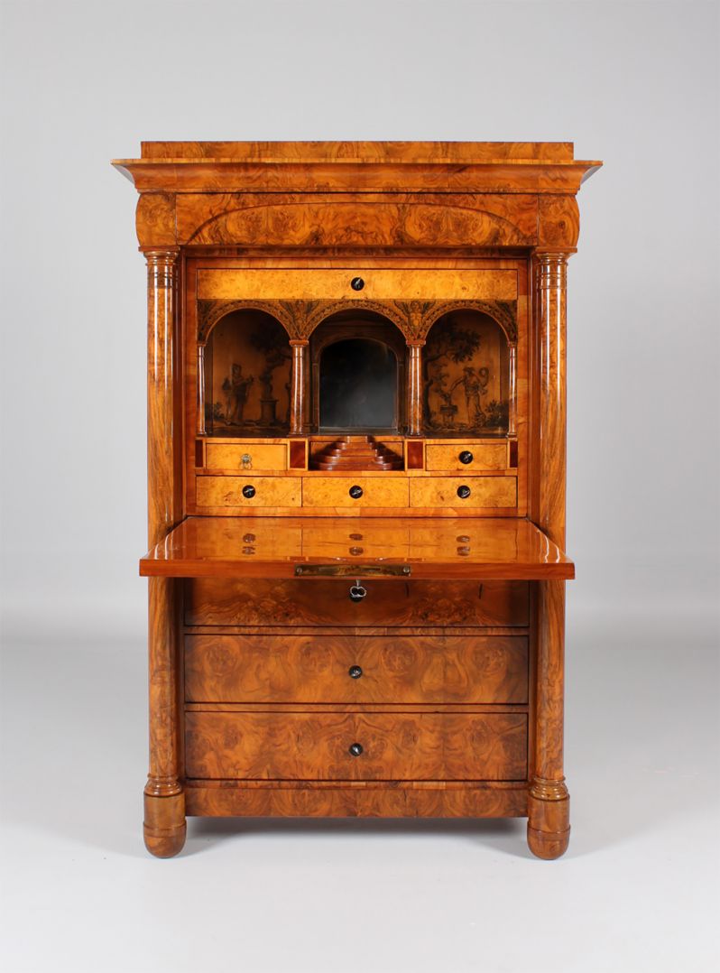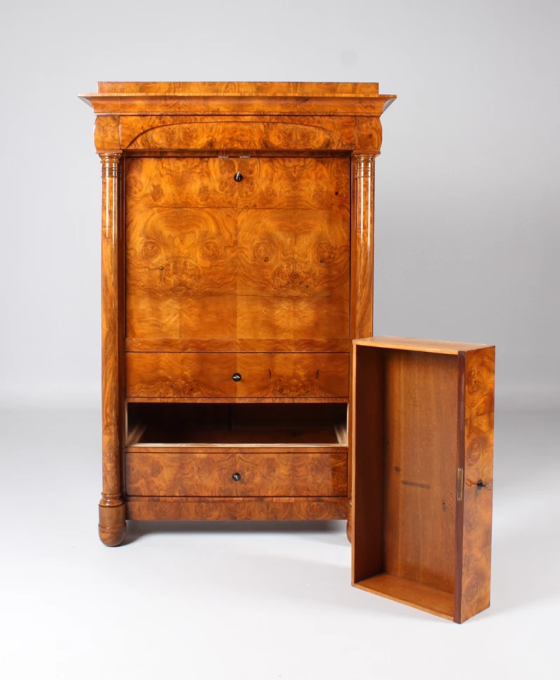 Il s'agit d'un meuble à écrire classique de l'époque Biedermeier avec trois tiroirs en bas, une surface d'écriture rabattable au-dessus et un autre tiroir en haut. Le meuble est flanqué de deux colonnes pleines.