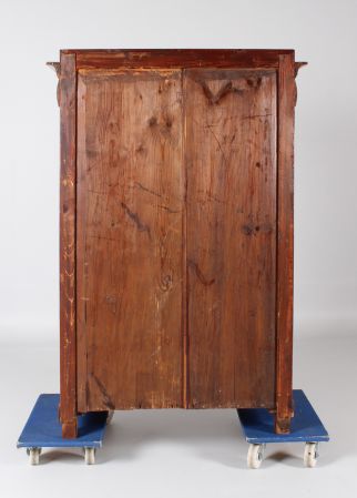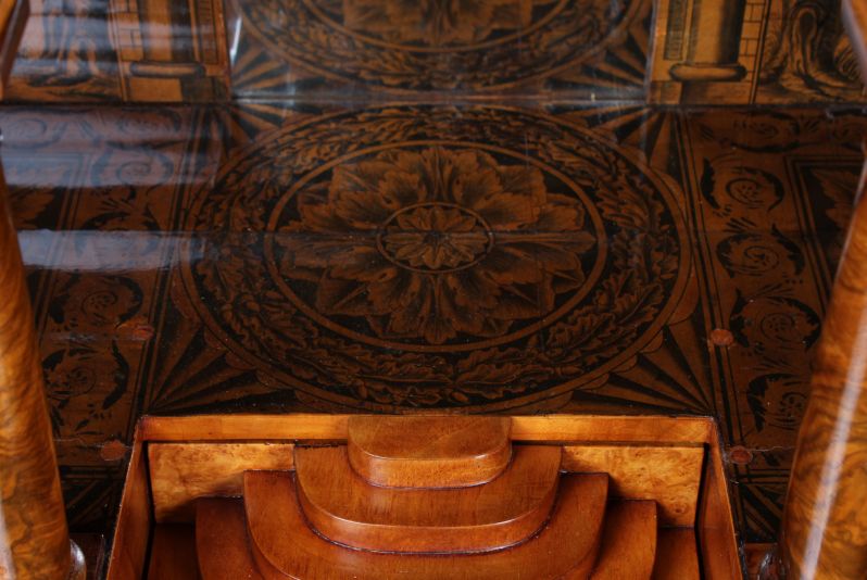La qualité exceptionnelle du placage, la conception architecturale de l'intérieur et surtout la manière dont les peintures à l'encre et les techniques de réimpression ont été réalisées laissent fortement penser que ce meuble a été créé dans l'atelier du maître ébéniste Wilhelm Kimbel de Mayence.