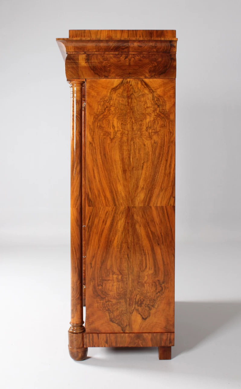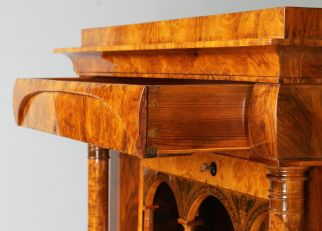 Vous verrez une grande particularité sur la photo qui montre le meuble de face, de biais. Vous constaterez ici que les colonnes sont également plaquées dans le sens de ce reflet. Le placage de rayons aussi petits exigeait une habileté artisanale exceptionnelle à l'époque de la création du meuble. Il a été réalisé avec une perfection qui laisse tout simplement pantois.