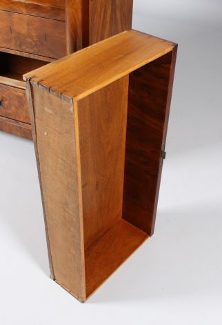 La zone légèrement bombée en dessous de la corniche ainsi que l'arc en forme de segment sur le tiroir supérieur sont typiques de la région de Mayence et du Palatinat.