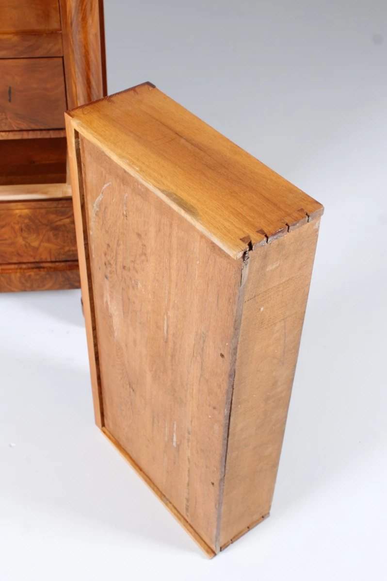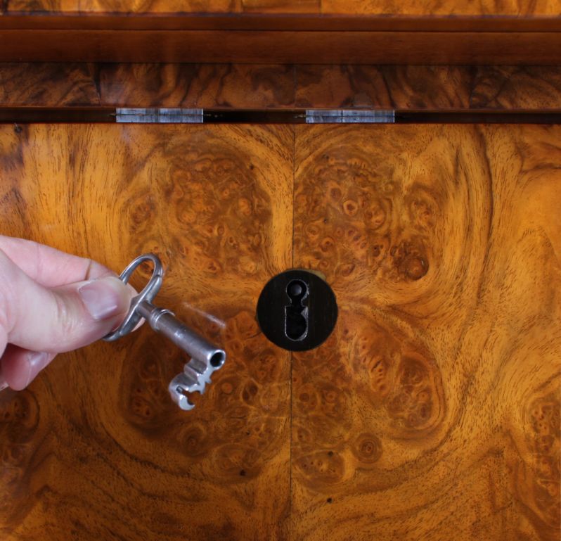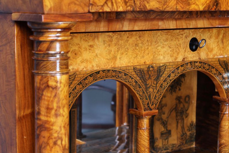 Le polissage à la gomme-laque donne au veinage une "profondeur" particulière. Toutes les serrures fonctionnent. Les plaques de clés, partiellement endommagées, ont été remplacées dans leur forme d'origine.