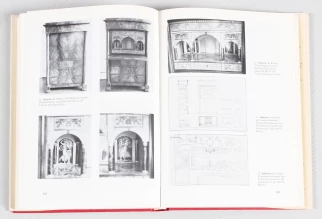 A l'intérieur du compartiment ouvert, le fond présente des ornements circulaires et floraux dans un langage des formes antique. Sur la paroi arrière, nous voyons à gauche et à droite du miroir des vestales en train d'offrir un holocauste.
