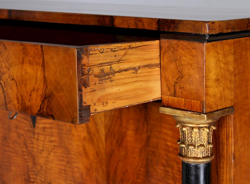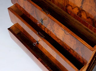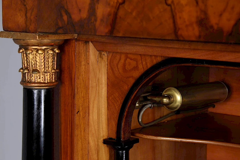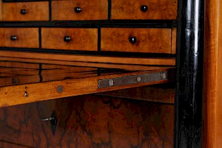 L'intérieur se compose de neuf tiroirs au total, plaqués en veinure d'orme. A l'extérieur des tiroirs, il y a un compartiment ouvert flanqué de deux colonnes pleines et un autre compartiment ouvert encadré d'arcs en plein cintre.