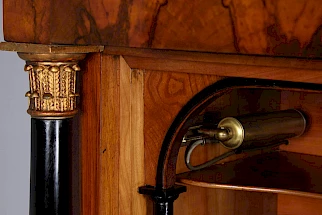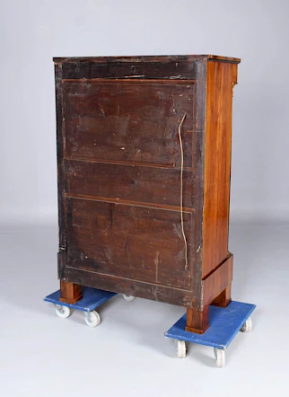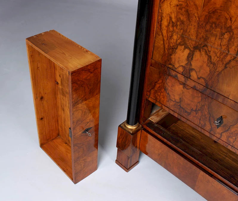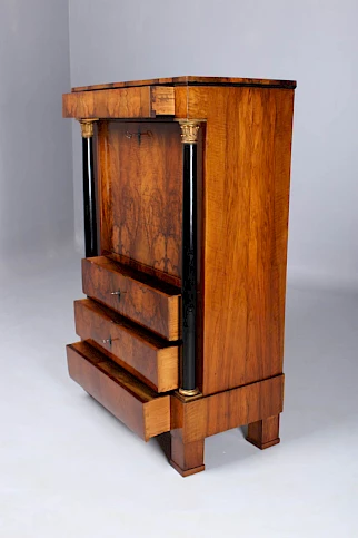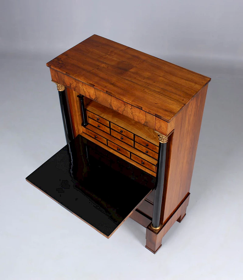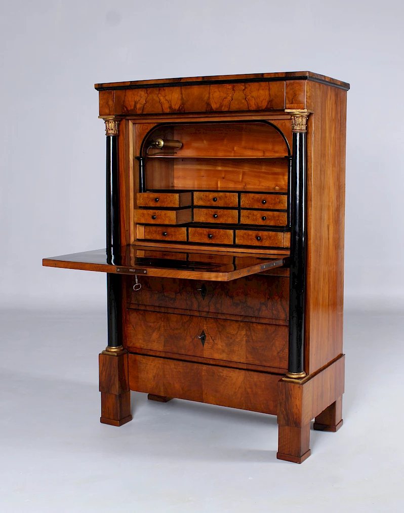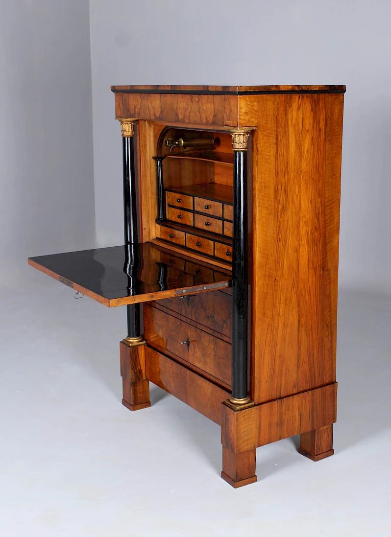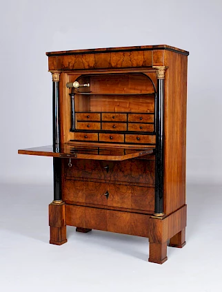 Le secrétaire sur pied classique, également appelé armoire à écrire, avec un plateau rabattable vers l'avant, n'est devenu vraiment populaire qu'à l'époque Biedermeier. Au XVIIIe siècle, les secrétaires étaient généralement équipés d'une fermeture à cylindre ou d'un volet oblique.