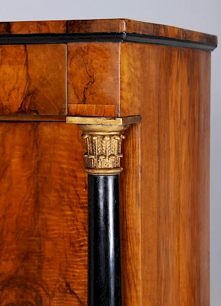 Le meuble repose sur des pieds massifs en forme de sabots. Les colonnes massives qui flanquent le meuble sont ébonisées avec des bases et des chapiteaux dorés.