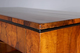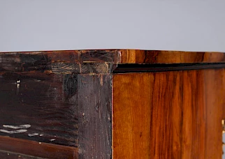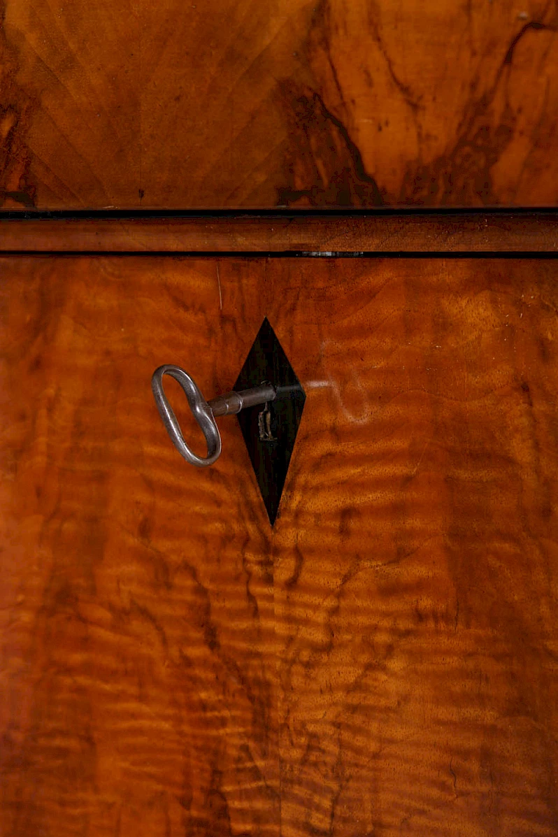 Fermé, il montre le grand art du placage de l'époque. Le choix du bois a été fait à la perfection, le veinage donne l'impression d'une œuvre d'art. Le bois peut être si beau !