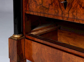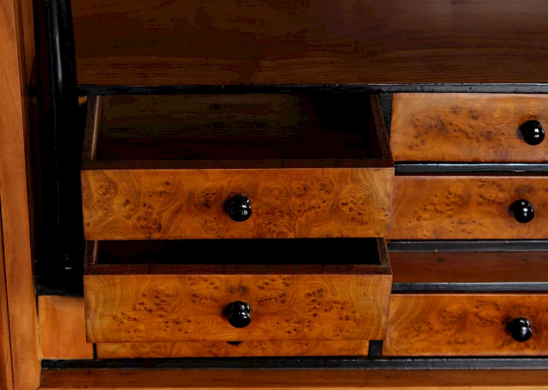 Ouvert, il montre la sobre élégance de l'époque Biedermeier avec ses petits tiroirs encadrés de noir et ses belles proportions.