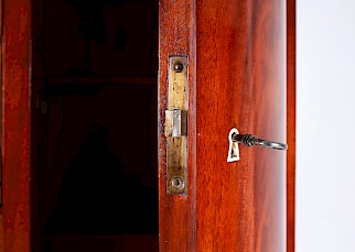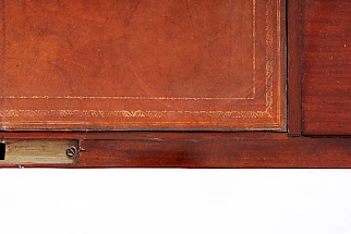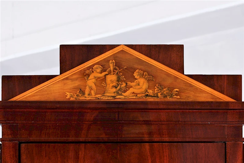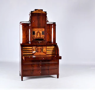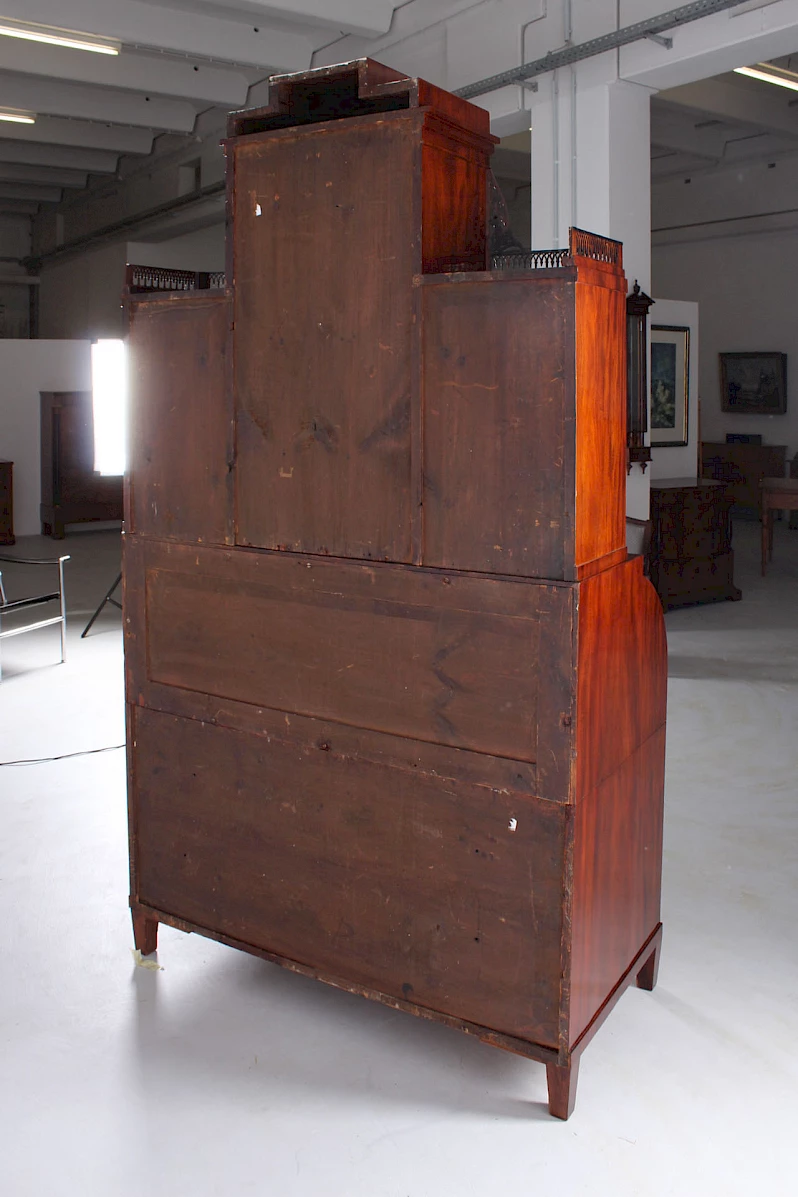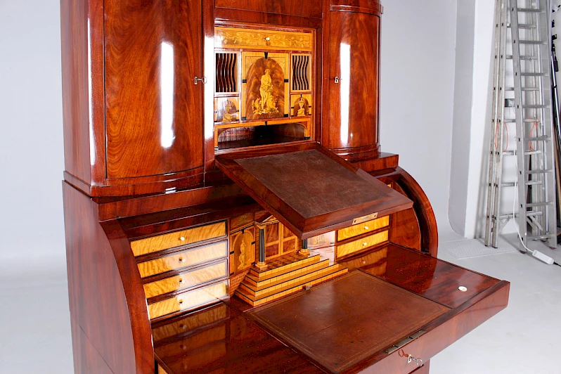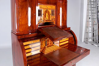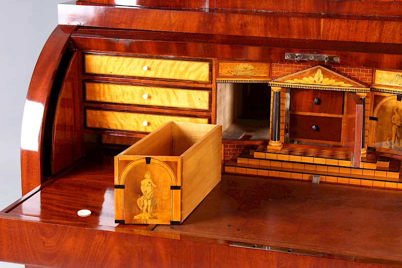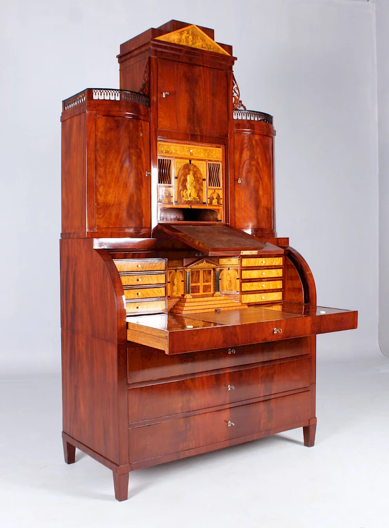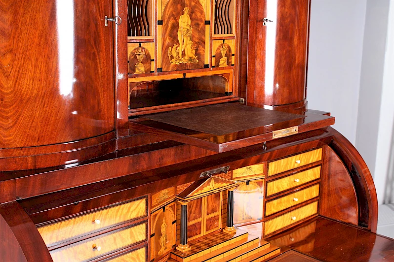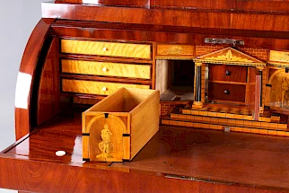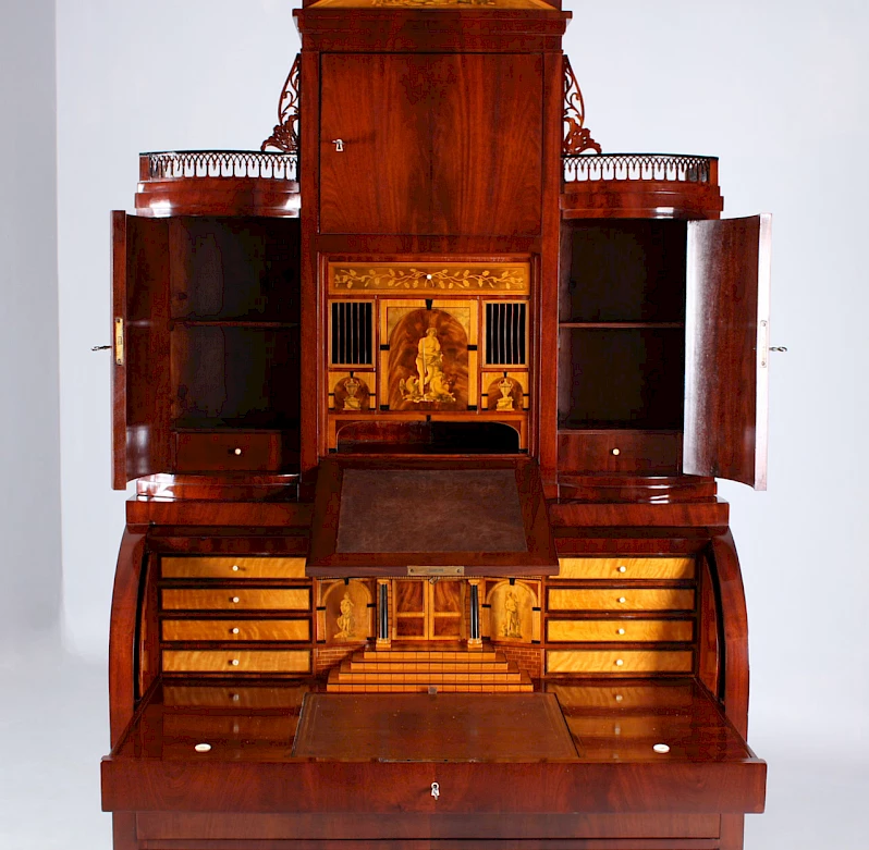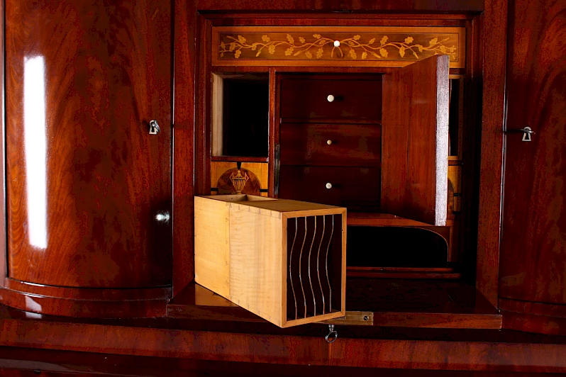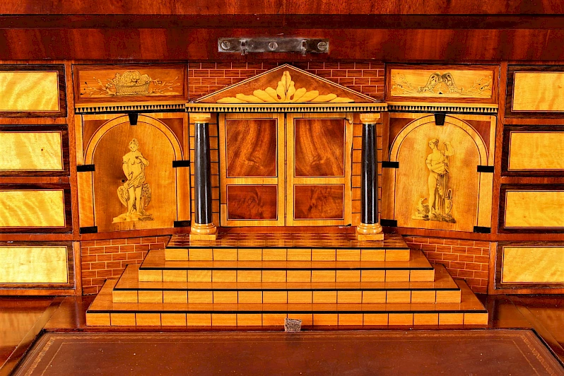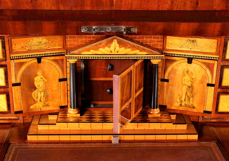 Derrière la porte centrale, qui s'ouvre grâce à un mécanisme secret, se trouvent trois autres petits tiroirs. Des compartiments à lettres et une surface d'écriture recouverte de cuir confèrent au compartiment une utilité pratique supplémentaire.