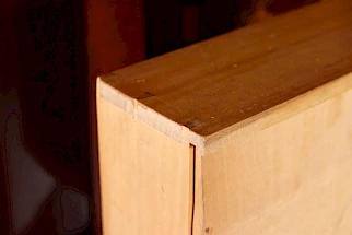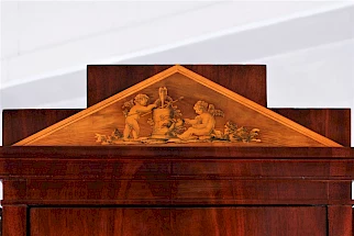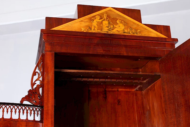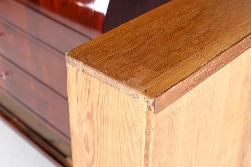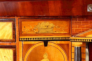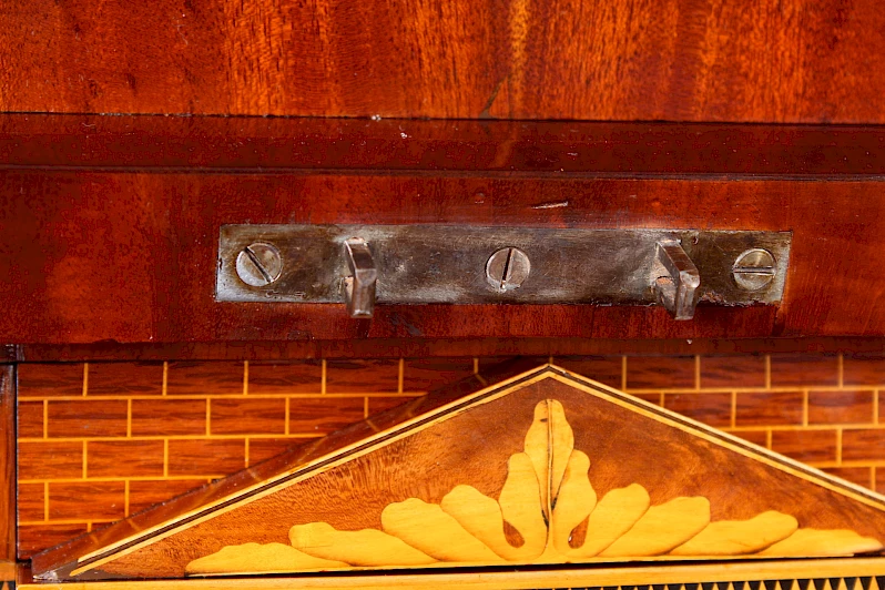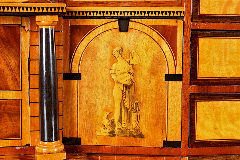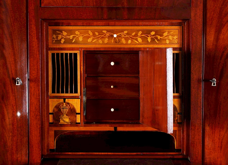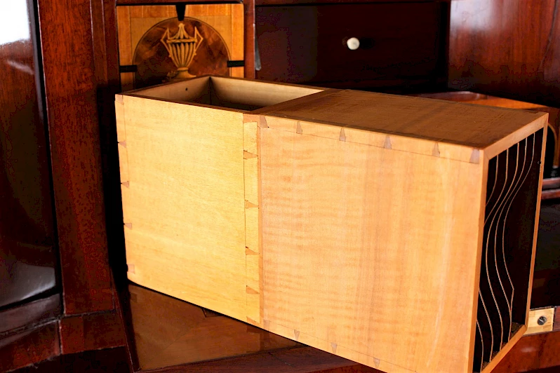 Dans la partie extérieure de l'intérieur, on trouve trois tiroirs superposés et un faux tiroir. Les façades plaquées géométriquement sont ornées d'incrustations de fils et de poignées en os.