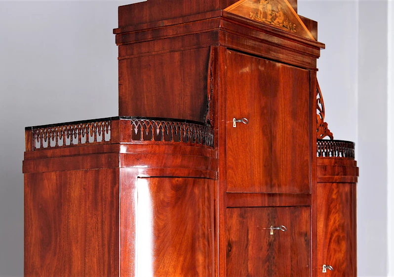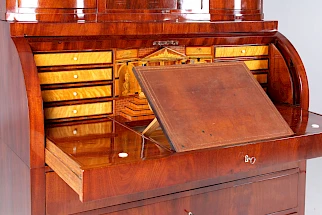 Au-dessus, derrière une fermeture cylindrique, se trouve le compartiment du secrétaire avec une surface d'écriture inclinée recouverte de cuir, à gauche et à droite duquel se trouve un tiroir. Au-dessus, nous voyons un intérieur de 12 pièces, plaqué en bouleau, acajou et érable.