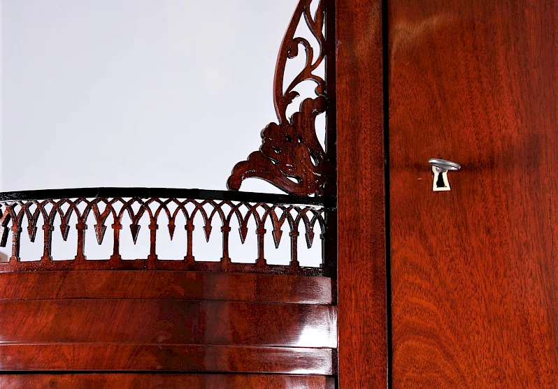 Une galerie ajourée ainsi qu'un escalier artistiquement conçu constituent la partie supérieure du meuble.