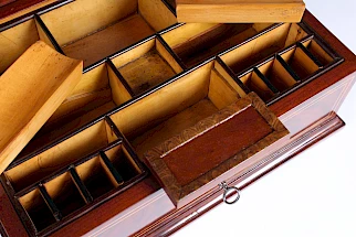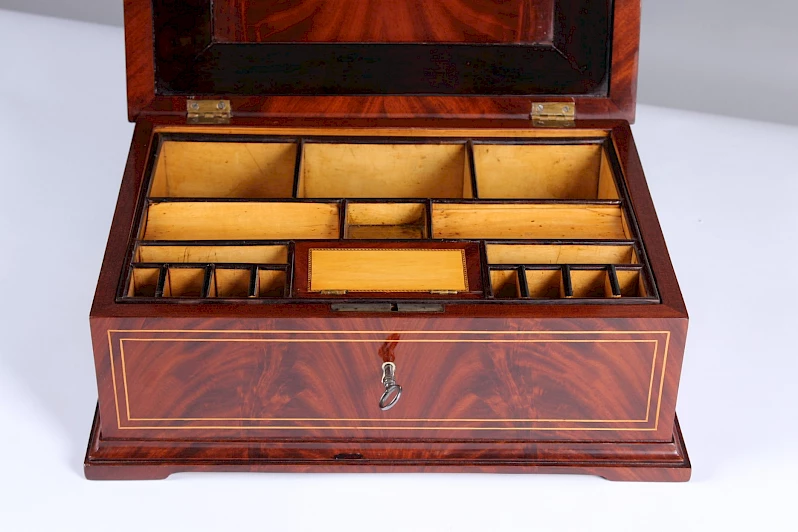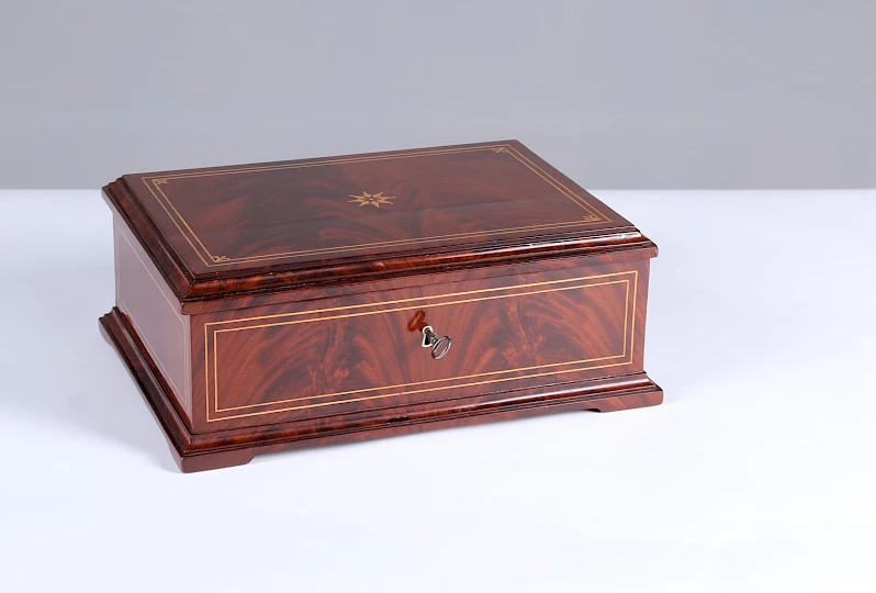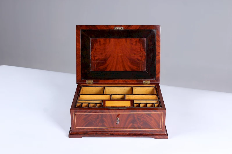 Coffret rectangulaire en placage d'acajou. Des incrustations de fils d'érable contrastent joliment avec le bois foncé et structurent les différentes surfaces.