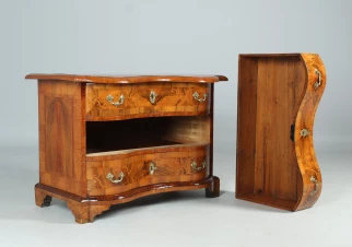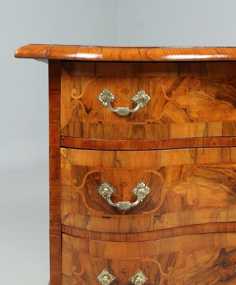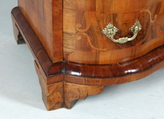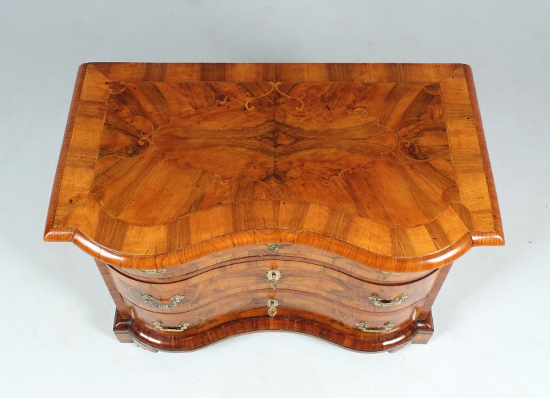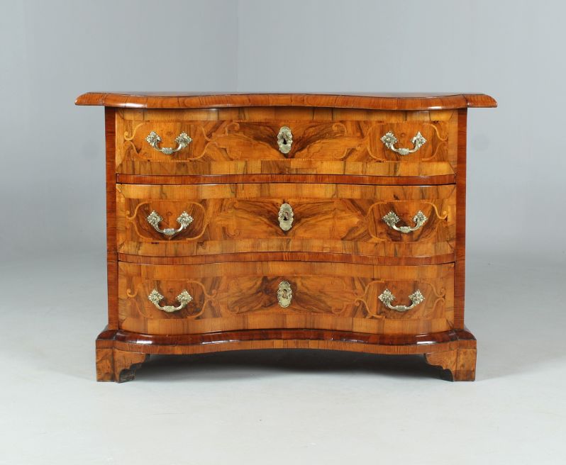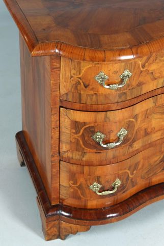 Commode à trois corps reposant sur un cadre de socle en saillie et des pieds artistiquement découpés. Le bord supérieur du socle est constitué de morceaux de prunier assemblés les uns aux autres.