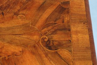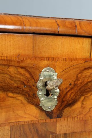 Les tiroirs et le plateau sont marqués de manière artistique. Nous voyons du noyer clair à l'extérieur et du noyer foncé à l'intérieur. La penture est travaillée en frêne, tout comme le bord du plateau et les traverses.