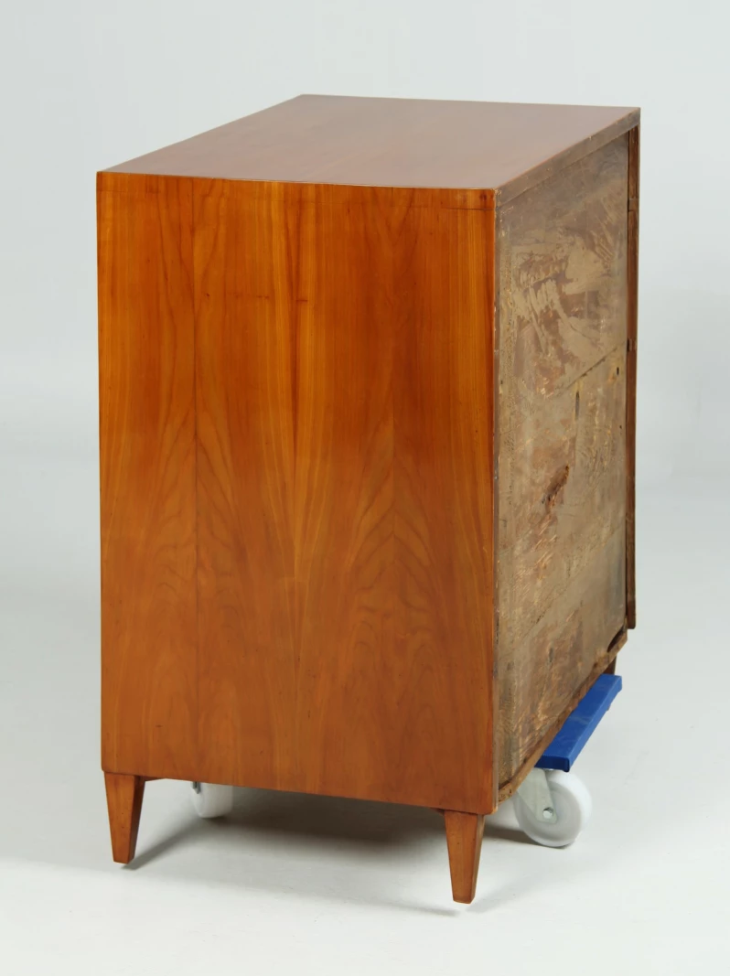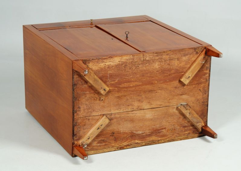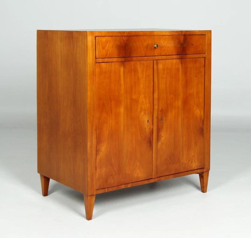 Le meuble présenté ici souligne de manière exemplaire la conception des premiers meubles bavarois Biedermeier, tant dans leur forme de base cubiste que dans leurs surfaces décorées uniquement par le bois.